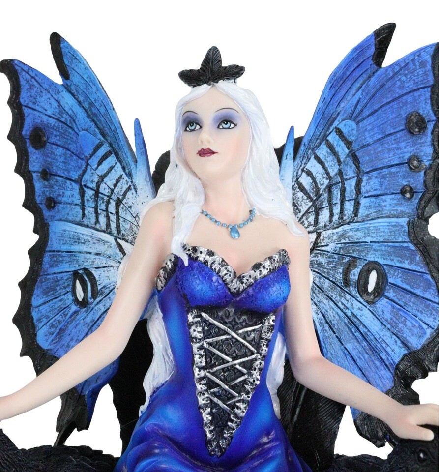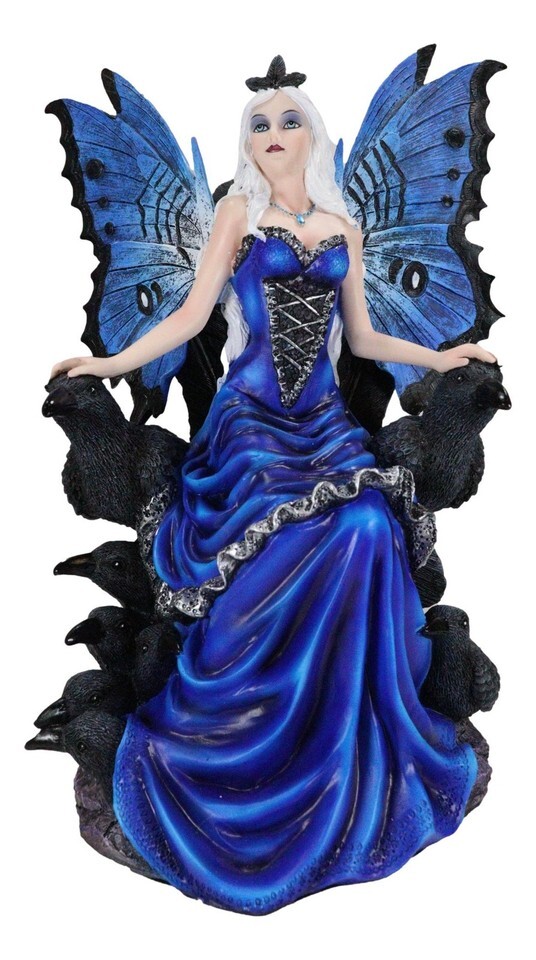 ? This sculpture features a beautiful Fairy Queen in a deep blue embroidered dress, with loyal crows by her side and forming a throne like seat.