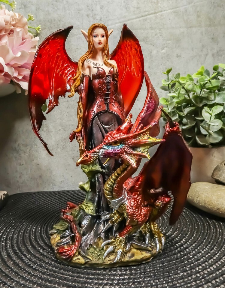 Ebros Red Fairy Dragon Figurine 8"H Pixie Fire Fairy W/ Chained Dragon Figurine
