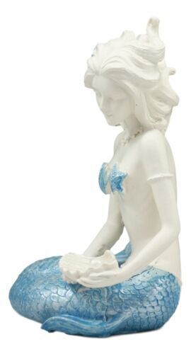 Nautical Ocean Goddess Pretty Mermaid With Blue Tail Holding Pearl Shell Statue