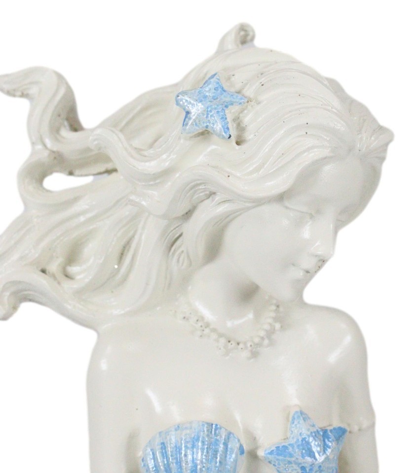 ? This Pretty Blue Tailed Mermaid sculpture is made of designer composite resin, hand painted and polished. Color Tone may vary