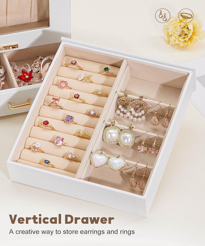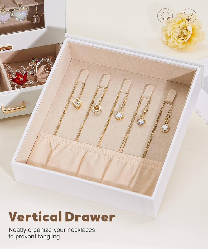 3 DRAWERS: Vertical drawer 1 has a ring roll and 3 removable six-hole earring cards. The vertical drawer 2 has 6 hooks with a storage bag for necklaces and pendants to prevent them from tangling. The horizontal drawer is divided into 2 large spaces, in which large accessories such as brooches, watches and headdress flowers can be placed