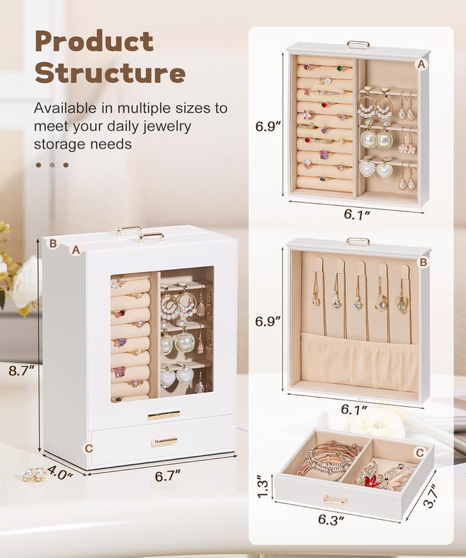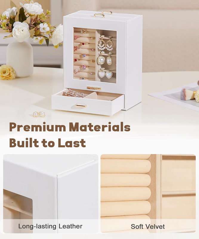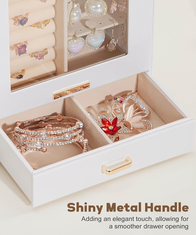 PERFECT DETAILS: Each drawer is equipped with a galvanized metal handle. A large transparent glass window in front of the jewelry box, offers you an open view of the displayed jewelry accessories, making it easy for you to take and place jewelries