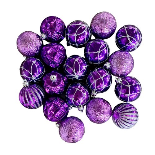 Lot of 19 purple lightweight ball ornaments. Various textures, some with glitter.