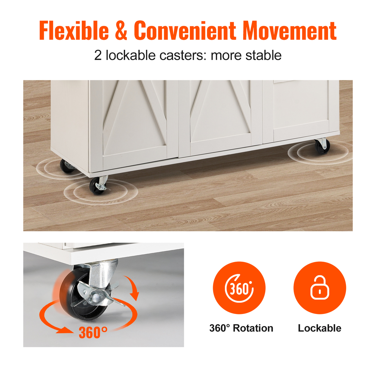Lockable Wheels for Mobility: Its four swivel casters can be easily moved around the kitchen, making it convenient to use wherever you need it. If you want to keep island stationery, these lockable casters give you the option. You can use the towel rack as a handle to help you move easily.