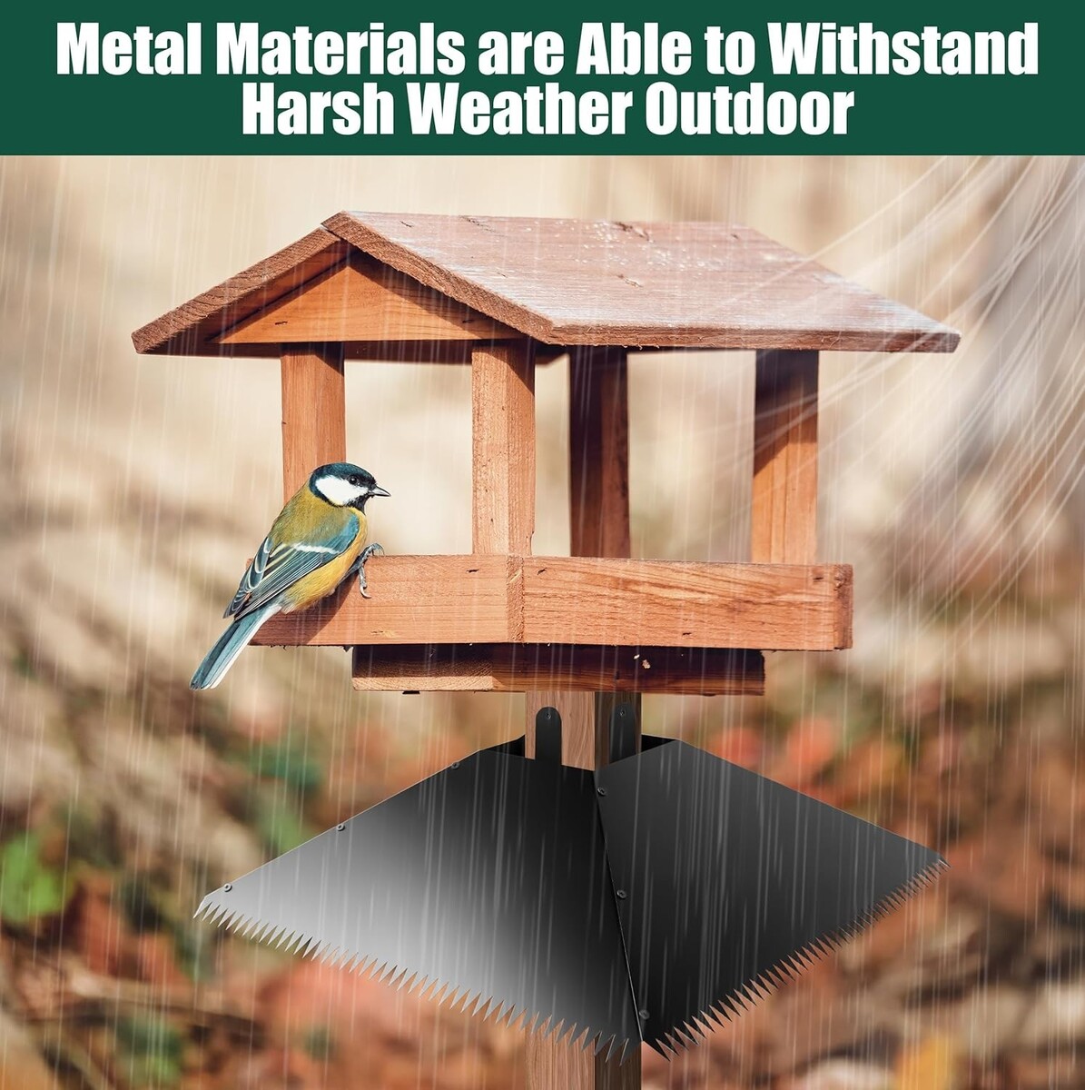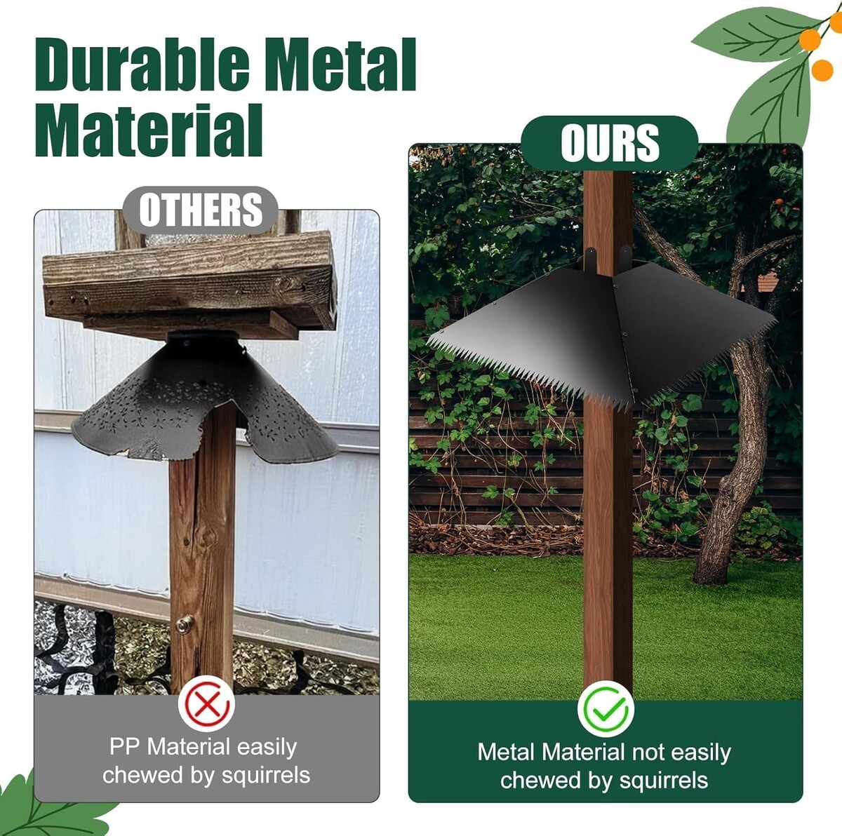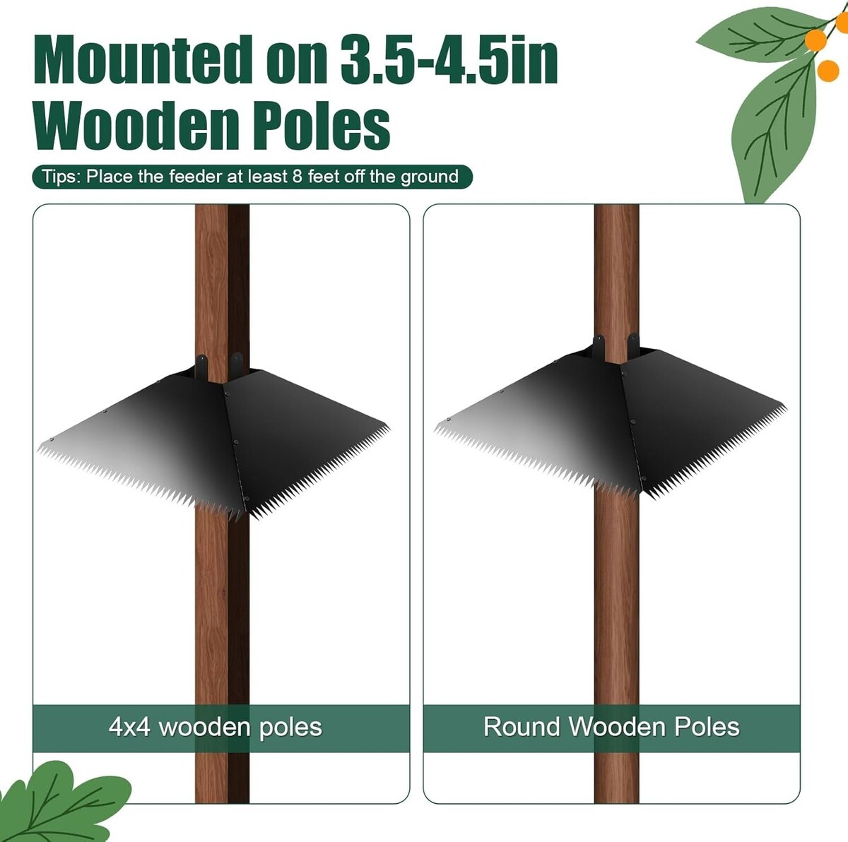 The squirrel stopper is a square design with spikes, which can solidly to 4x4 posts or round wood poles with diameters of 3.4 inches to 4.5 inches. The surface of the metal material is smooth so that squirrels have no grip to climb up the bird feeder. (It is recommended to mount 8 Feet off the ground since squirrels can jump at least 4 feet vertically)