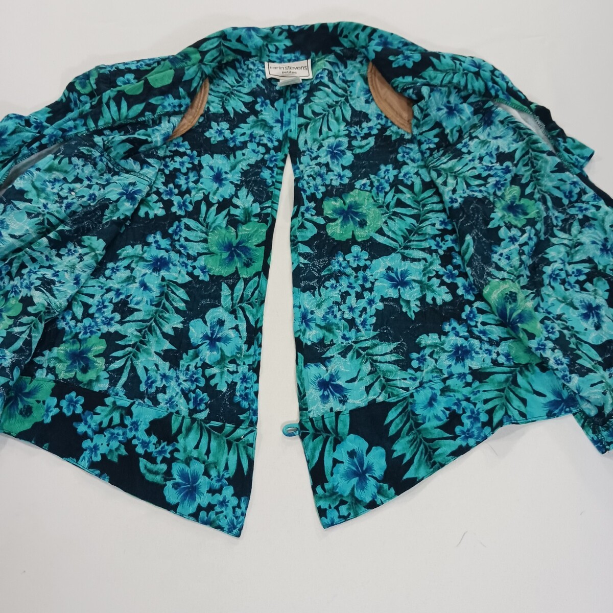 Vintage 80's KARIN STEVENS Women's Green/Black Floral Open Back Blouse Size 12P
