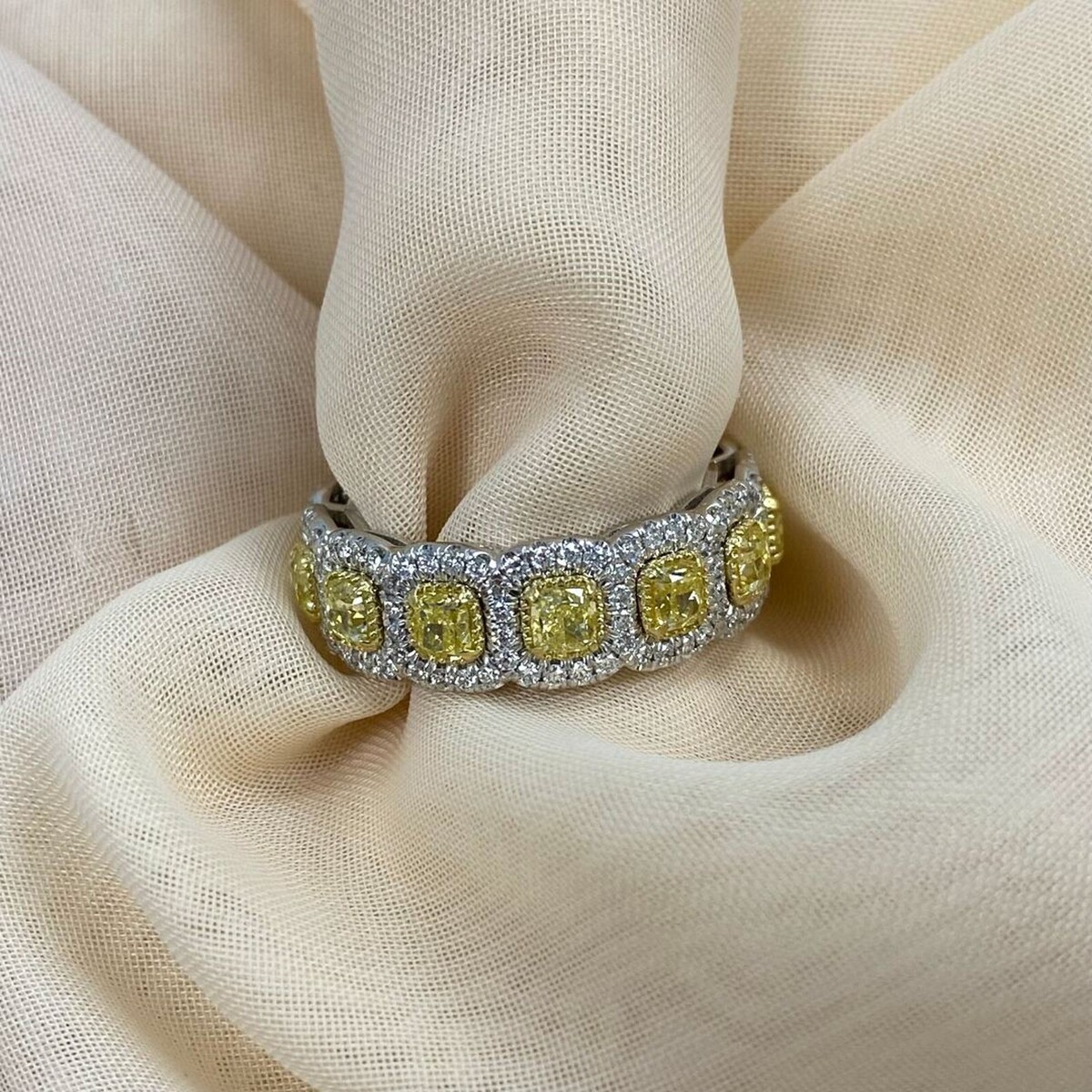 Spectacular one of a kind wedding band will add magic to special moment!! This art deco design eternity wedding band features 13 cushion cut natural fancy yellow diamonds individually edged in colorless micro pave halo. Handcrafted in 14k white and yellow gold completed with a high polish. The total carat weight is 4.02 carats. This is amazing gift for your lovely one!