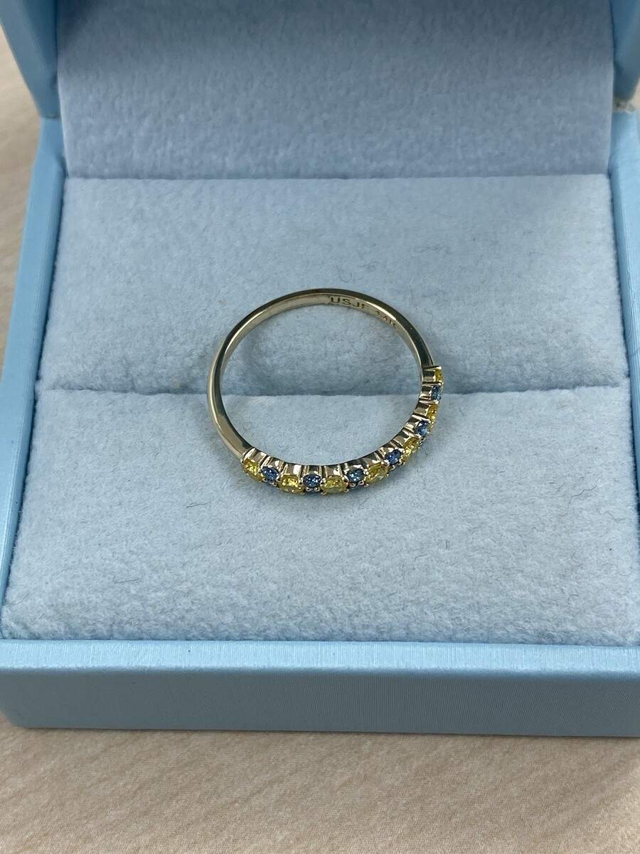 Cette alliance presente un design alterne de diamants de laboratoire de couleur bleue et jaune sertis sur griffes avec un poids total de diamants de 0,50 carat. Fabrique a la main en or jaune 14 carats et complete par une finition polie pour un effet brillant. La largeur est de 3,3 mm. La largeur de la tige est de 1,6 mm.