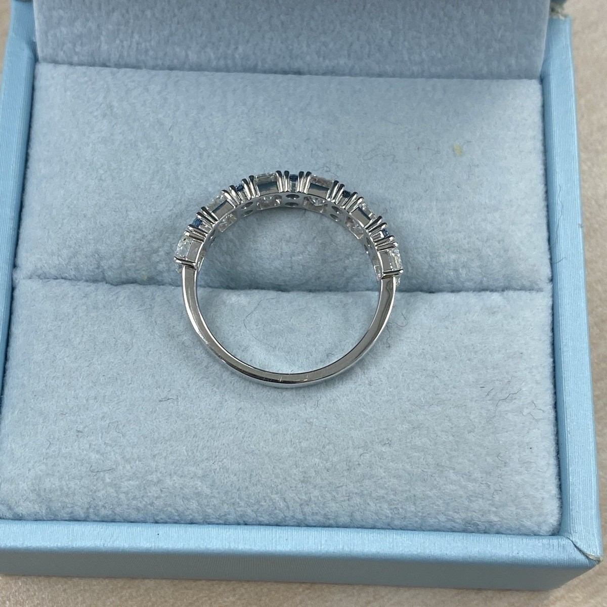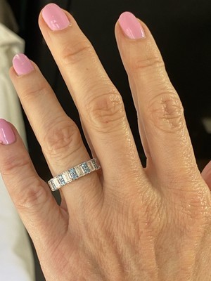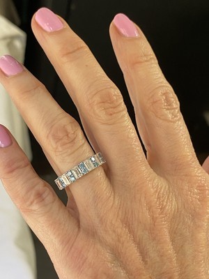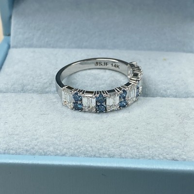 Cette alliance en diamant serti griffes est une expression eblouissante d?amour et d?engagement !! Fabrique dans un superbe or massif 14 carats, il comporte 6 diamants de laboratoire taille brillant emeraude blanche et 10 pierres bleues rondes taille brillant, chacun solidement maintenu dans un sertissage a griffes classique. Le poids total en carats est de 2,00 carats. Que ce soit comme alliance d'anniversaire ou de mariage, sa beaute intemporelle captivera l'attention partout où vous allez.