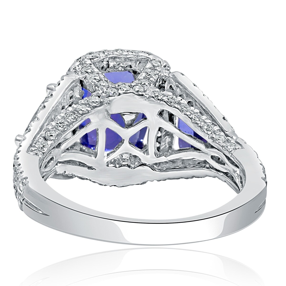 Uno dei tipi di fidanzamento presenta un tanzanite tagliato a cuscino blu da 1,97 carati circondato da un alone di diamanti tagli rotondi incolori in ambientazione di micro pavimentazione. Ulteriori diamanti fiancheggiano il gambo con 2 trilioni di tanzaniti viola blu che completano l'eleganza luccicante di questo anello. L'anello e realizzato in oro bianco da 18 carati che brilla con una finitura polacca alta. Il peso totale dei carati e di 4,38 carati.