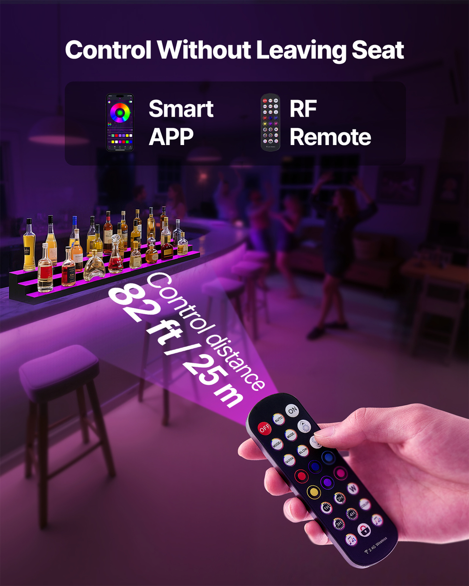 Multiple Control Methods: Supports dual distant wireless control via RF remote (up to 82ft) smart app (up to 33ft), unlocking brightness, speed, timing, and music-sync lighting controls for personalized ambiance