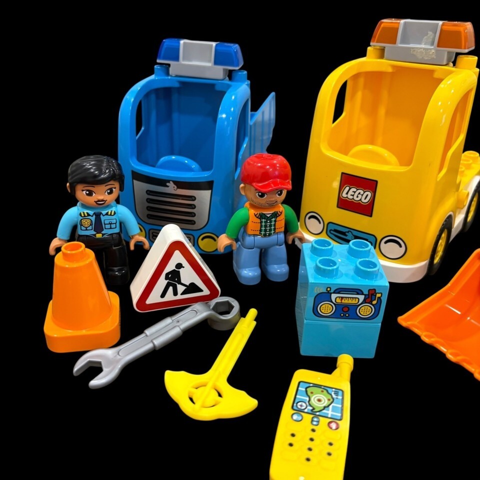 This Lego Duplo set includes construction-themed vehicles and figures, designed for young builders to engage in imaginative play.
