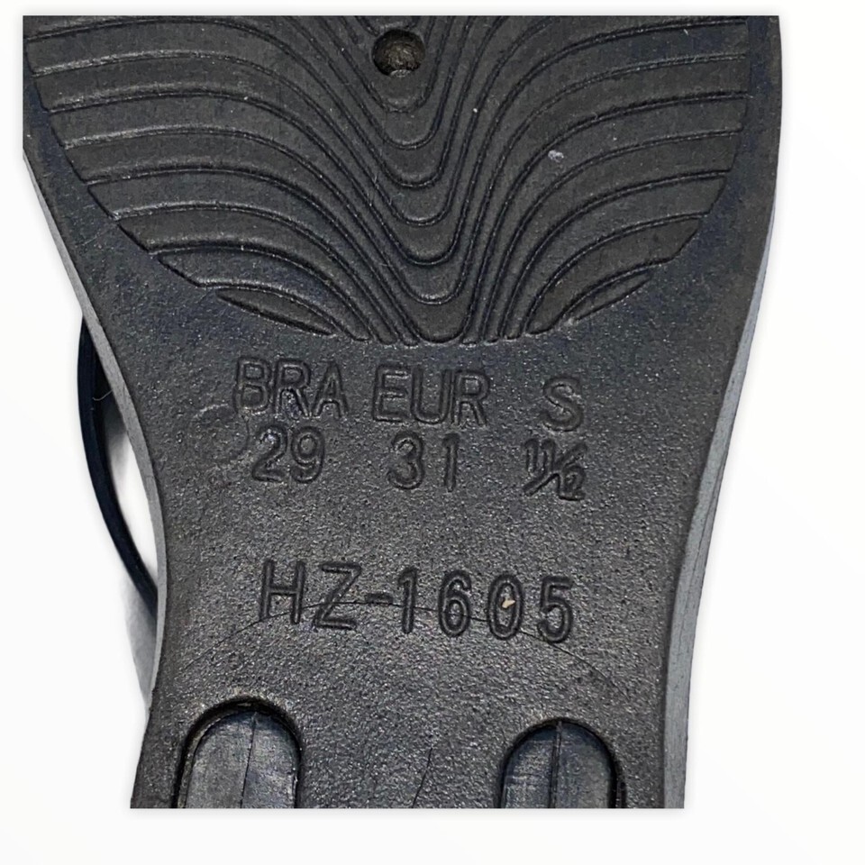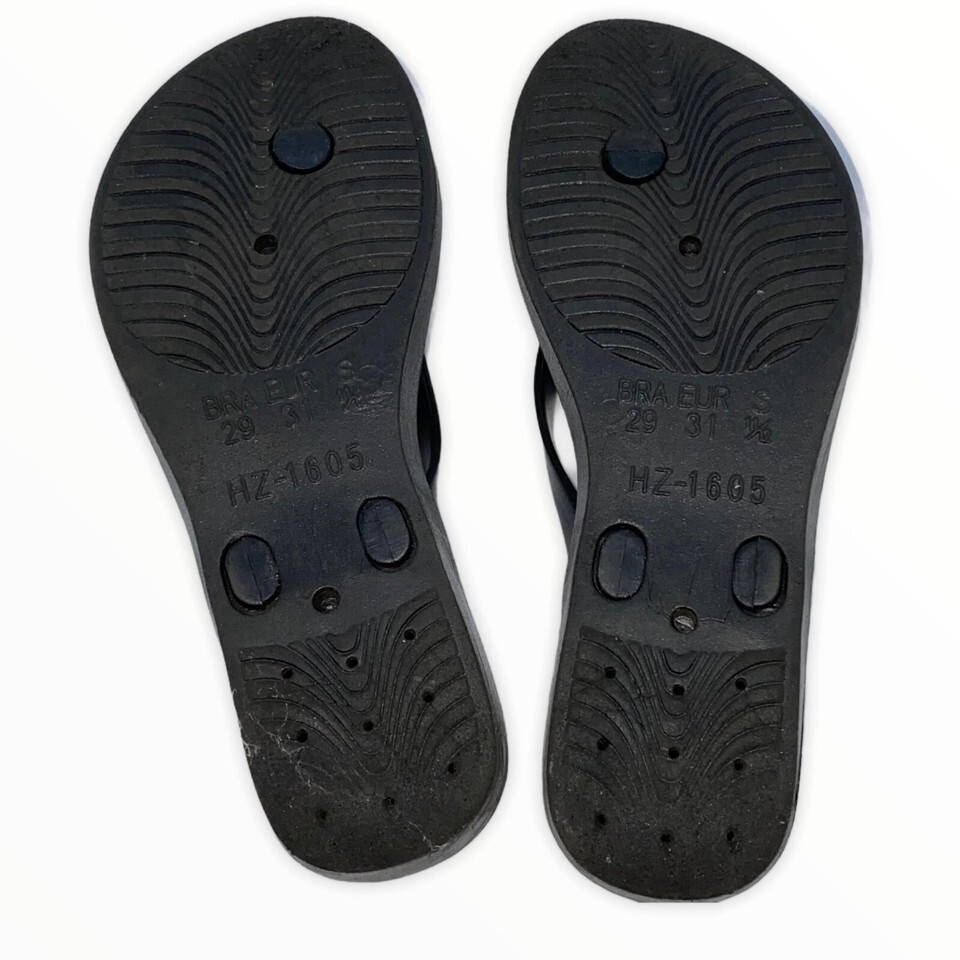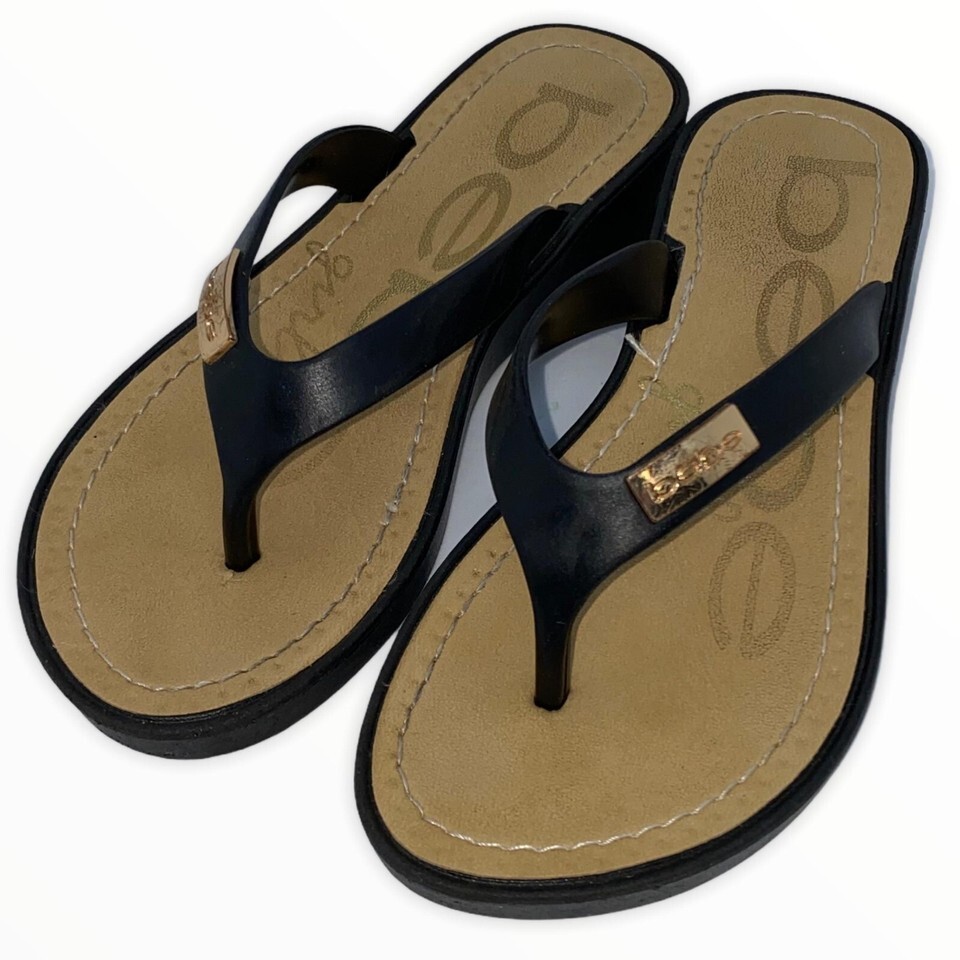 These girls black with gold accent label thong sandals are like new, from a smoke free and pet free home.
