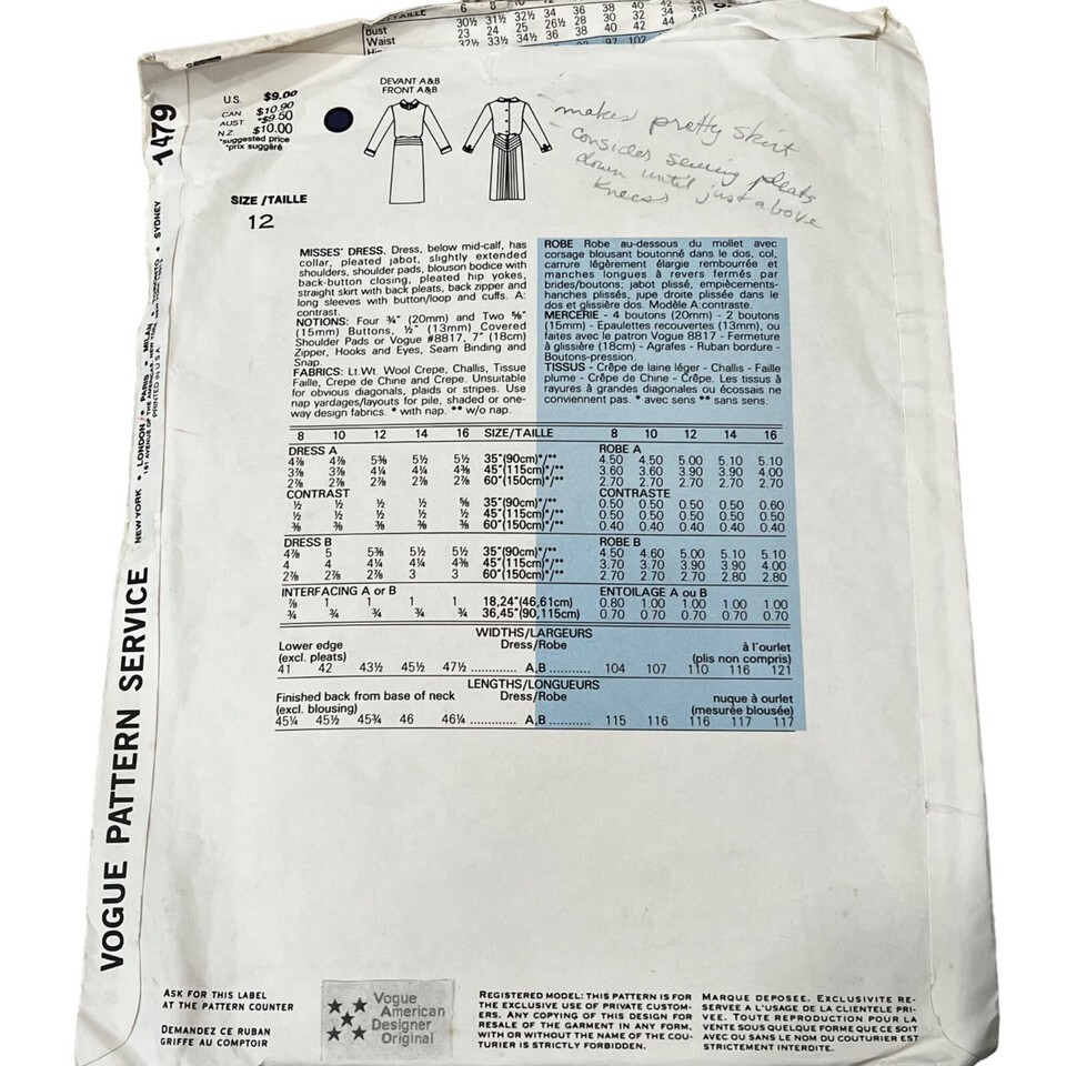 Create elegant, timeless dresses with this Vogue Patterns 1479 by Albert Nipon. Size 12, featuring sophisticated designs for various occasions.