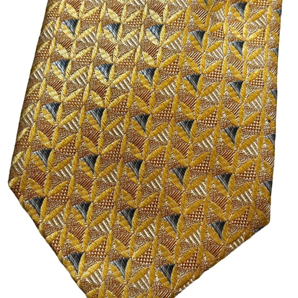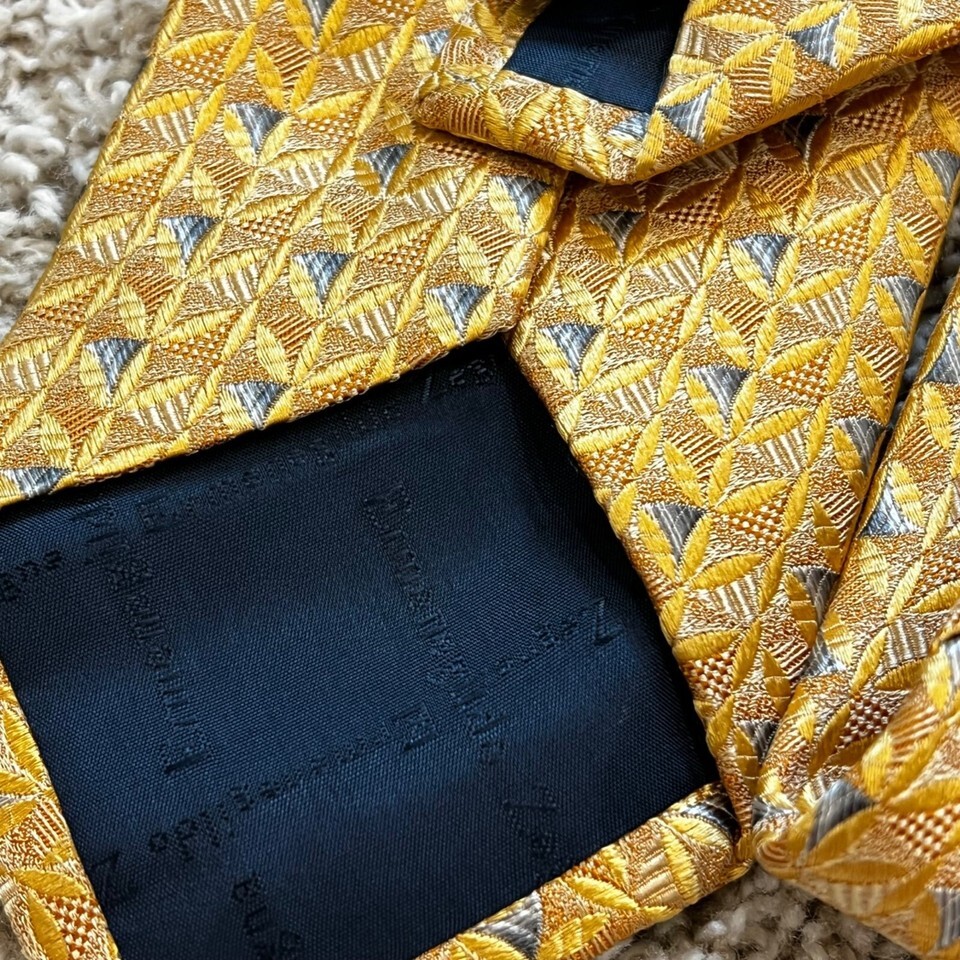 Stylish Ermenegildo Zegna silk tie featuring an elegant gold and silver geometric pattern. A luxurious addition to any formal attire.
