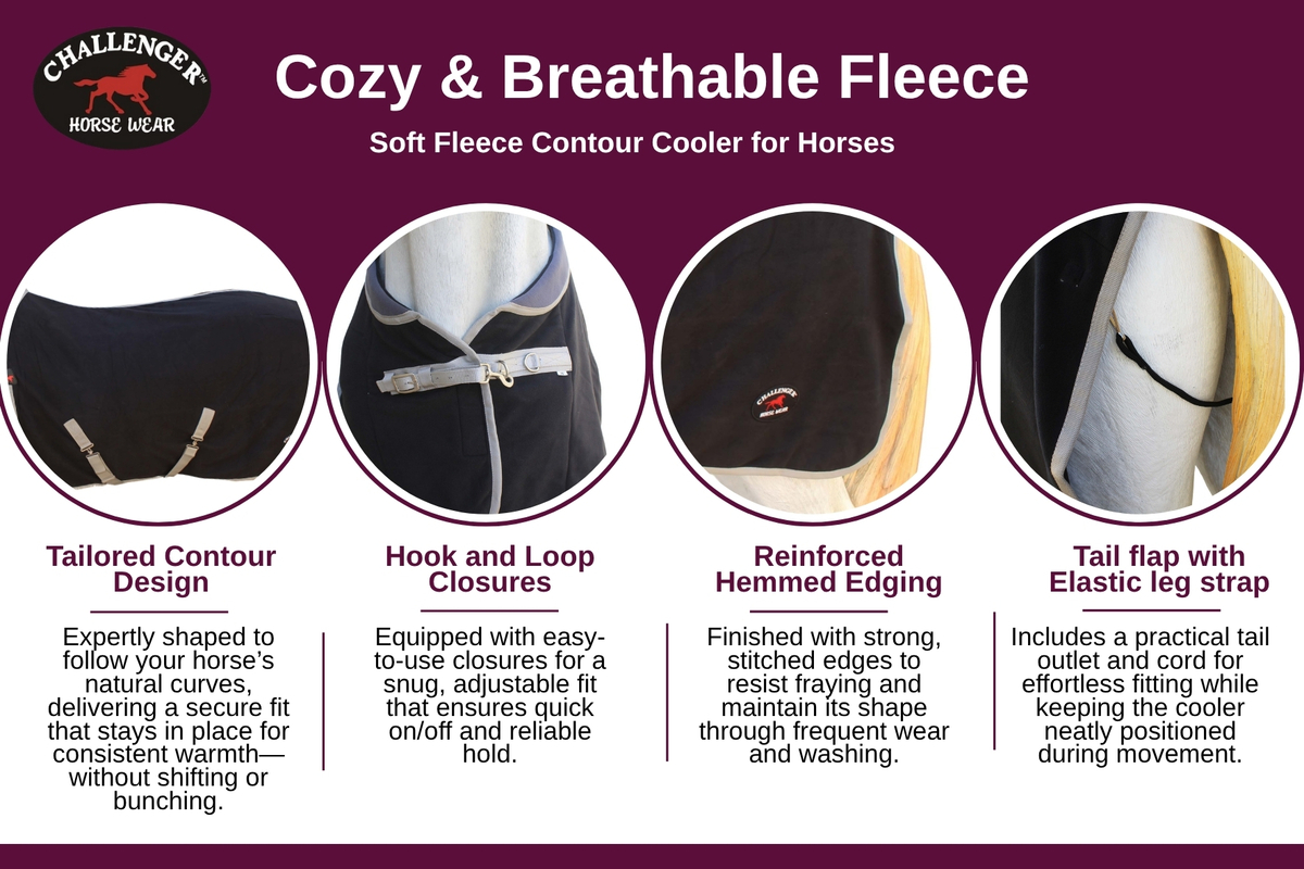 Challenger soft fleece cooler is a multipurpose lightweight blanket. Fleece Coolers are used to help your horse cool down after a workout or physical exercise, but can also be used to add a layer of warmth on a chilly night. The soft fleece is made of breathable fabric which allows sweat and moisture on the horse's coat to escape. Features a soft fleece trim at the neck of this blanket for added comfort for your horse. The quick-clip front closure helps make taking off blanket very easy. Adjustable cross surcingles help keep blanket secure and in place. Shoulder gusset offers freedom of movement.