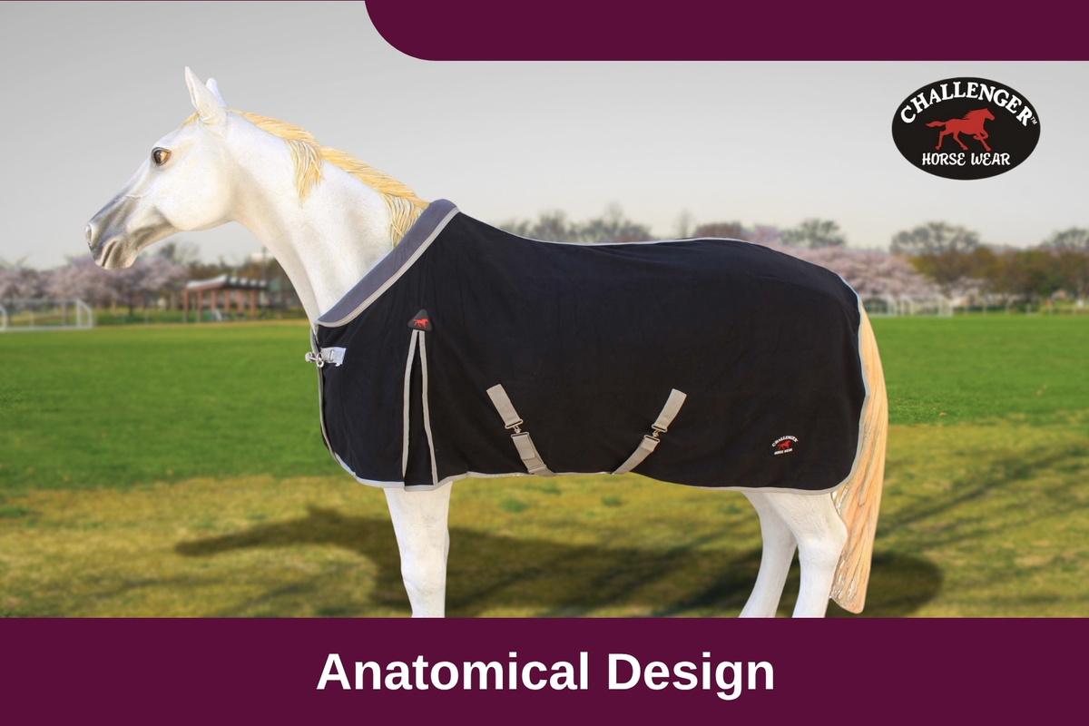 Challenger soft fleece cooler is a multipurpose lightweight blanket. Fleece Coolers are used to help your horse cool down after a workout or physical exercise, but can also be used to add a layer of warmth on a chilly night. The soft fleece is made of breathable fabric which allows sweat and moisture on the horse's coat to escape. Features a soft fleece trim at the neck of this blanket for added comfort for your horse. The quick-clip front closure helps make taking off blanket very easy. Adjustable cross surcingles help keep blanket secure and in place. Shoulder gusset offers freedom of movement.