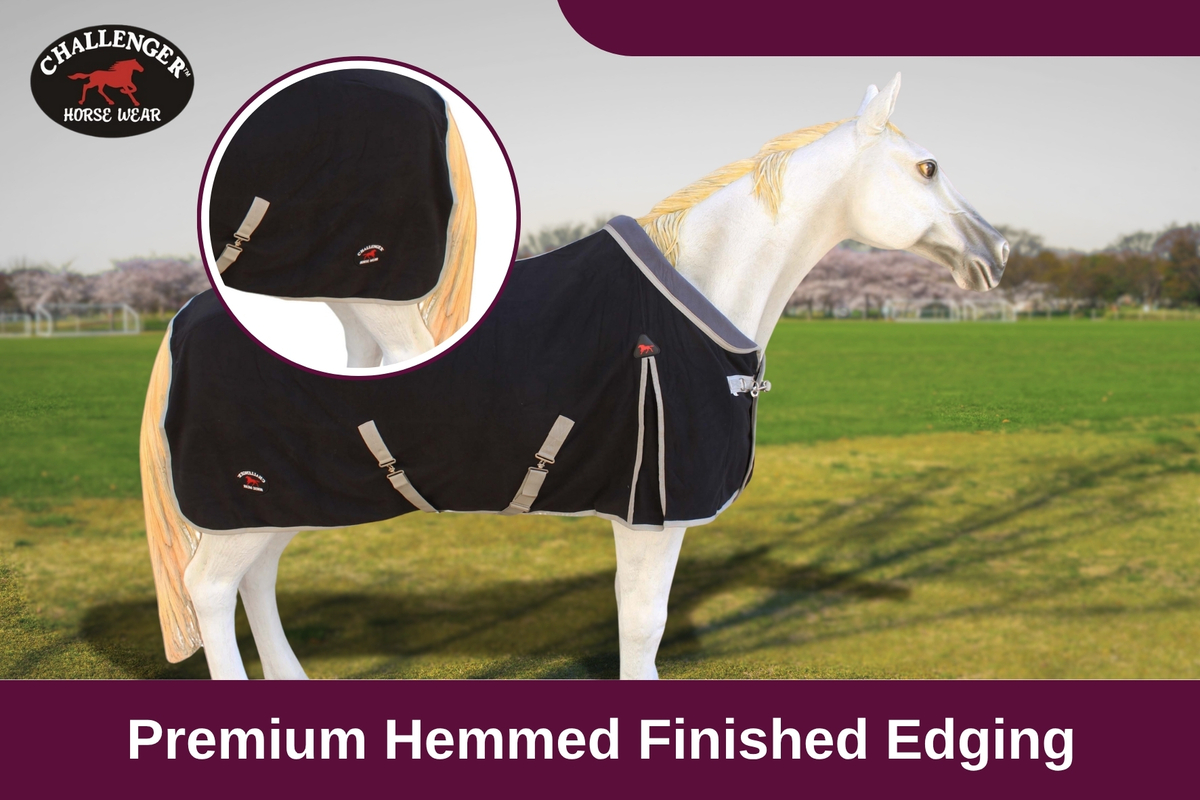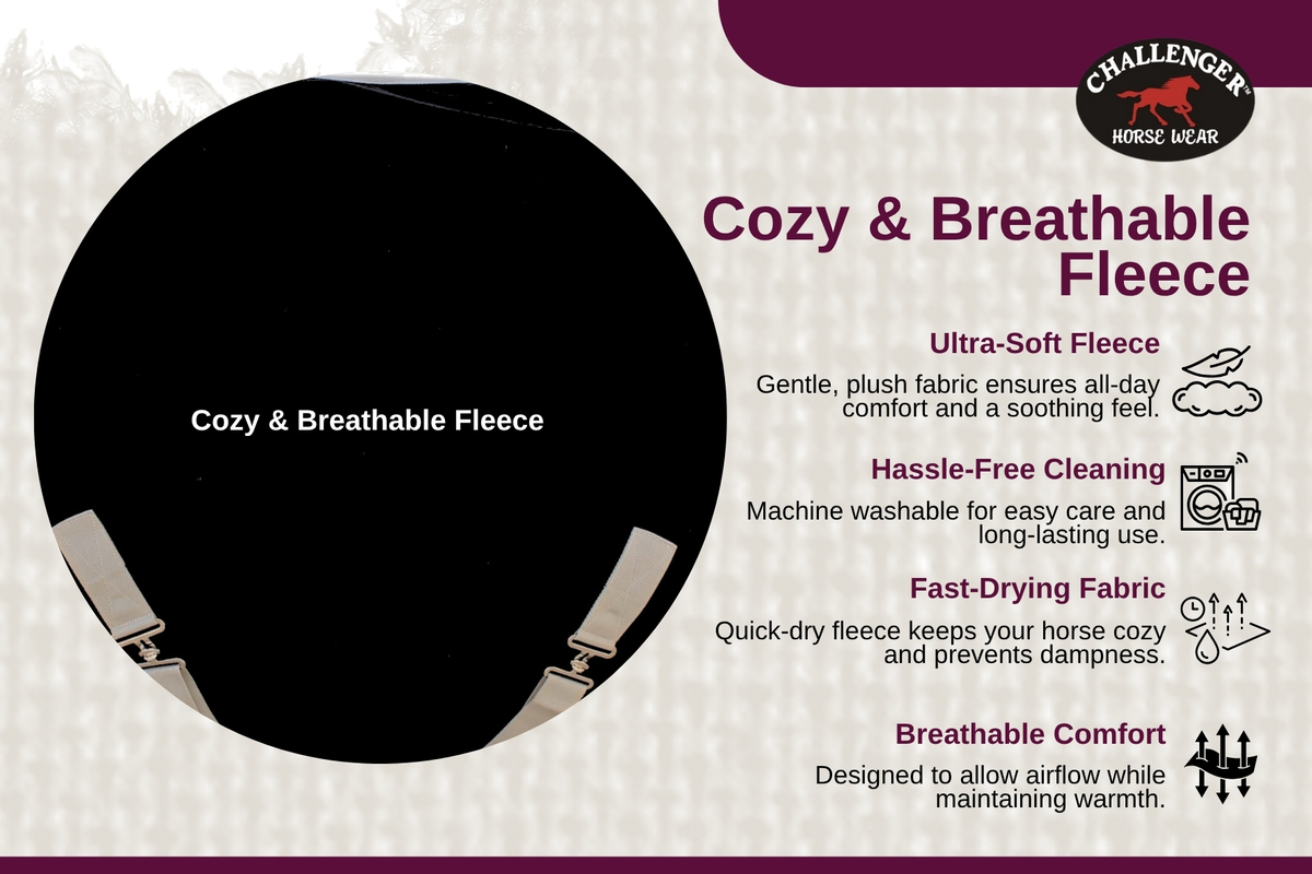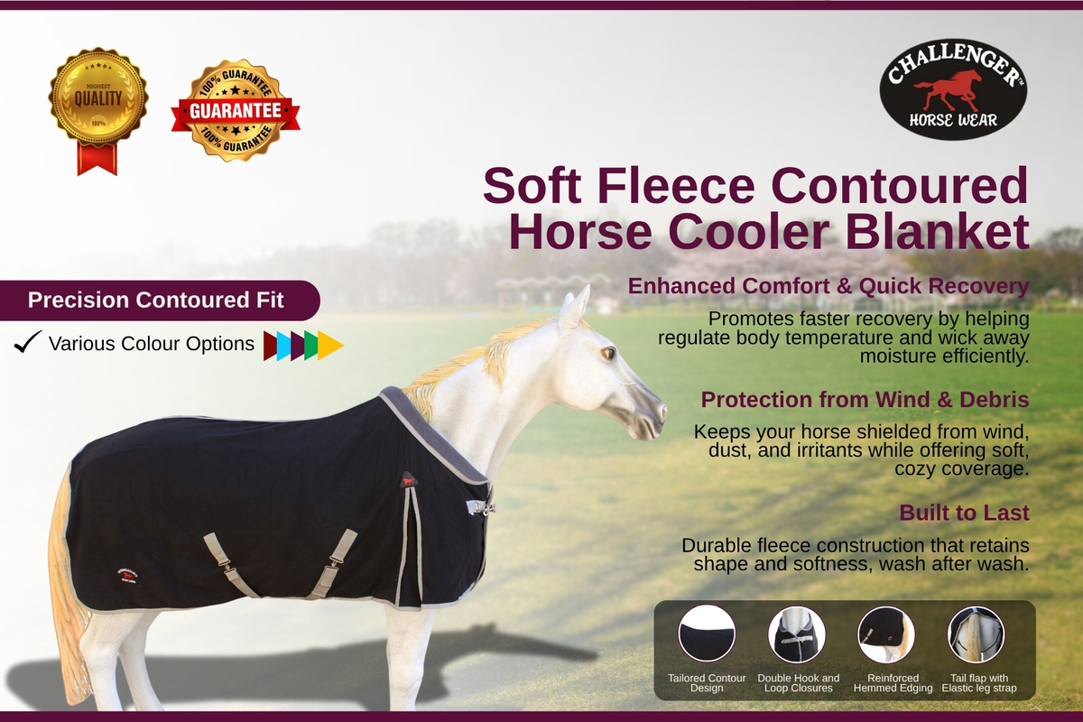 Challenger soft fleece cooler is a multipurpose lightweight blanket. Fleece Coolers are used to help your horse cool down after a workout or physical exercise, but can also be used to add a layer of warmth on a chilly night. The soft fleece is made of breathable fabric which allows sweat and moisture on the horse's coat to escape. Features a soft fleece trim at the neck of this blanket for added comfort for your horse. The quick-clip front closure helps make taking off blanket very easy. Adjustable cross surcingles help keep blanket secure and in place. Shoulder gusset offers freedom of movement.