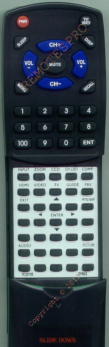 Product description: This is a custom built replacement remote made by Redi Remote for the DYNEX remote control number RC2010B. *This is NOT an original remote control. It is a custom replacement remote made by Redi-Remote* This remote control is specifically designed to be compatible with the following models of DYNEX units: 6010200102, DXLCD2209, DXLCD3209, DXLCD37092, DXLCD42HD09, RC2010B *If you have any concerns with the remote after purchase, please contact me directly* There is a cover over the lower half of the remote. This will slide down to reveal the lower half buttons.