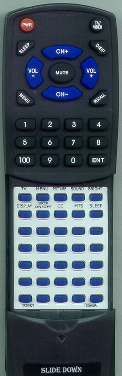Product description: This is a custom built replacement remote made by Redi Remote for the TOSHIBA remote control number 72001927. *This is NOT an original remote control. It is a custom replacement remote made by Redi-Remote* This remote control is specifically designed to be compatible with the following models of TOSHIBA units: CT864, 14DL74, 14DL74M, 20DL74, 20VL14, 72001927 *If you have any concerns with the remote after purchase, please contact me directly* There is a cover over the lower half of the remote. This will slide down to reveal the lower half buttons.