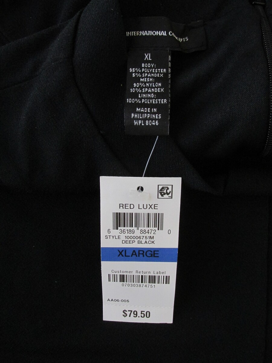 Description: Up for sale is an International Concepts (NWT) "Red Luxe" women's sleeveless dress. It is made of 95%polyester/5%spandex knit fabric for a lot of stretch. The size is XL. the color is deep black. This dress is solid black with illusion on both shoulders. It is fully lined and has a zipper in the back for easy on and off. It has an attached $79.50 price ticket. This is a great dress for cocktail parties weddings.
