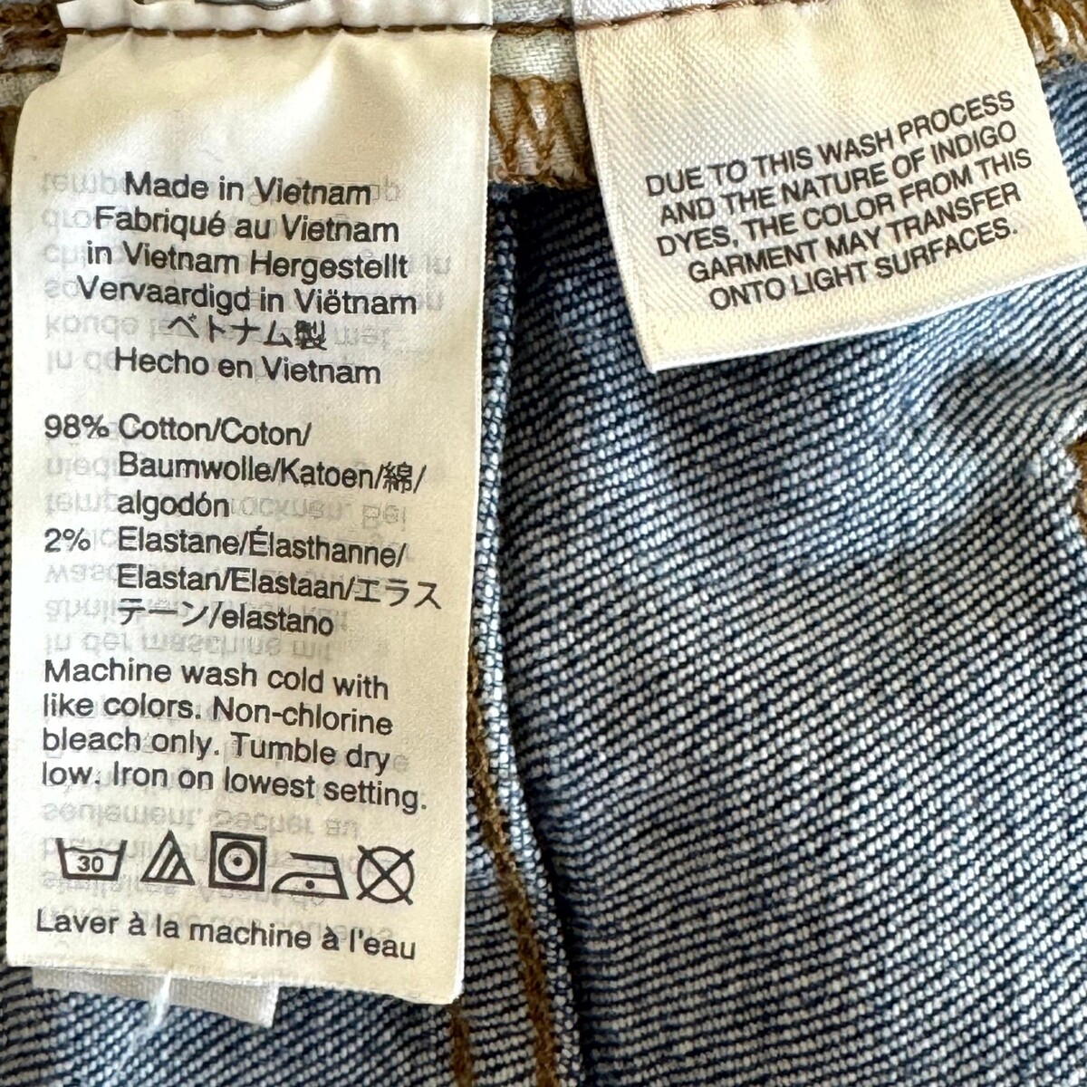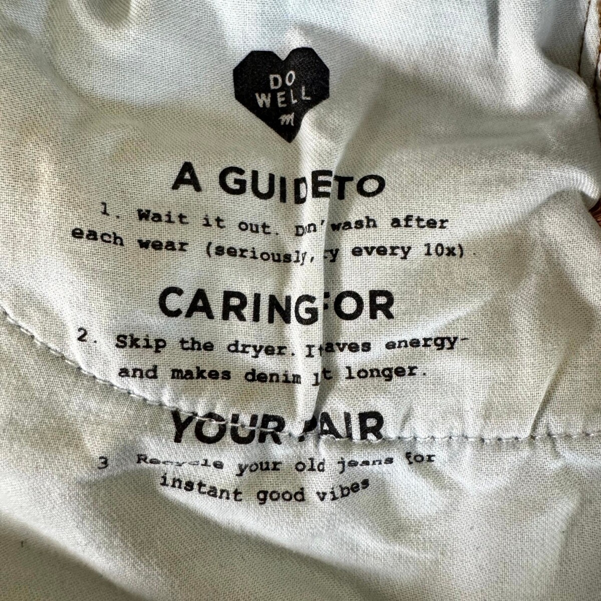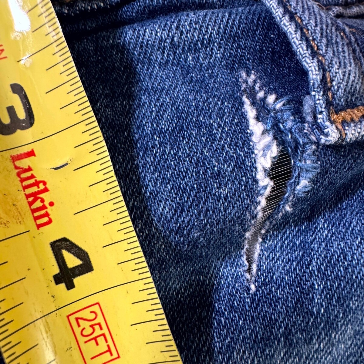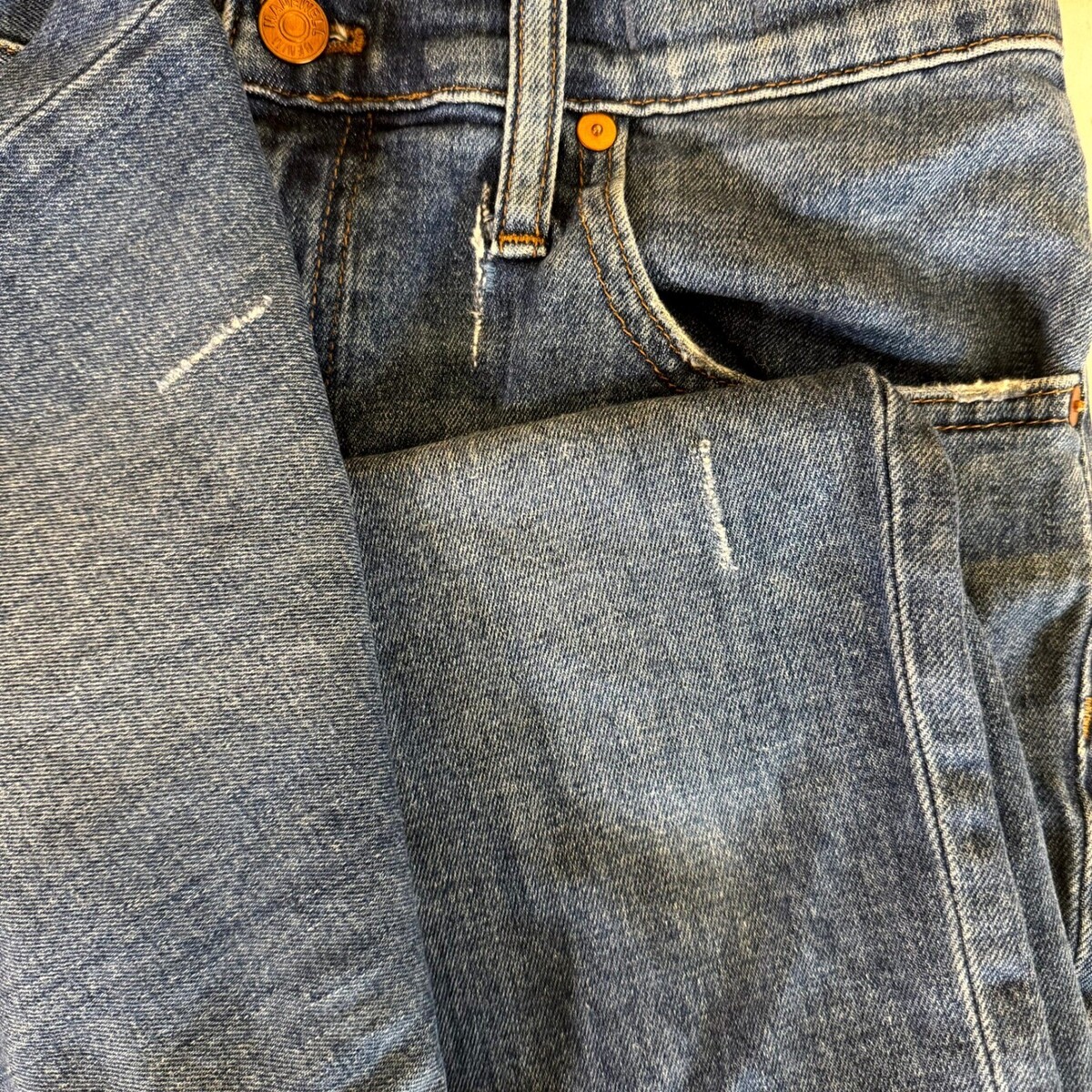 Classic Madewell "Do Well" denim made in a Fair Trade Certified? factory. Mid-weight blue wash with light fading and intentional distressing. The three small "slices" in the denim are part of the factory distressing ? not damage ? and the elastane fibers remain intact. One small area by the left pocket opening shows similar treatment (see close-up photo).