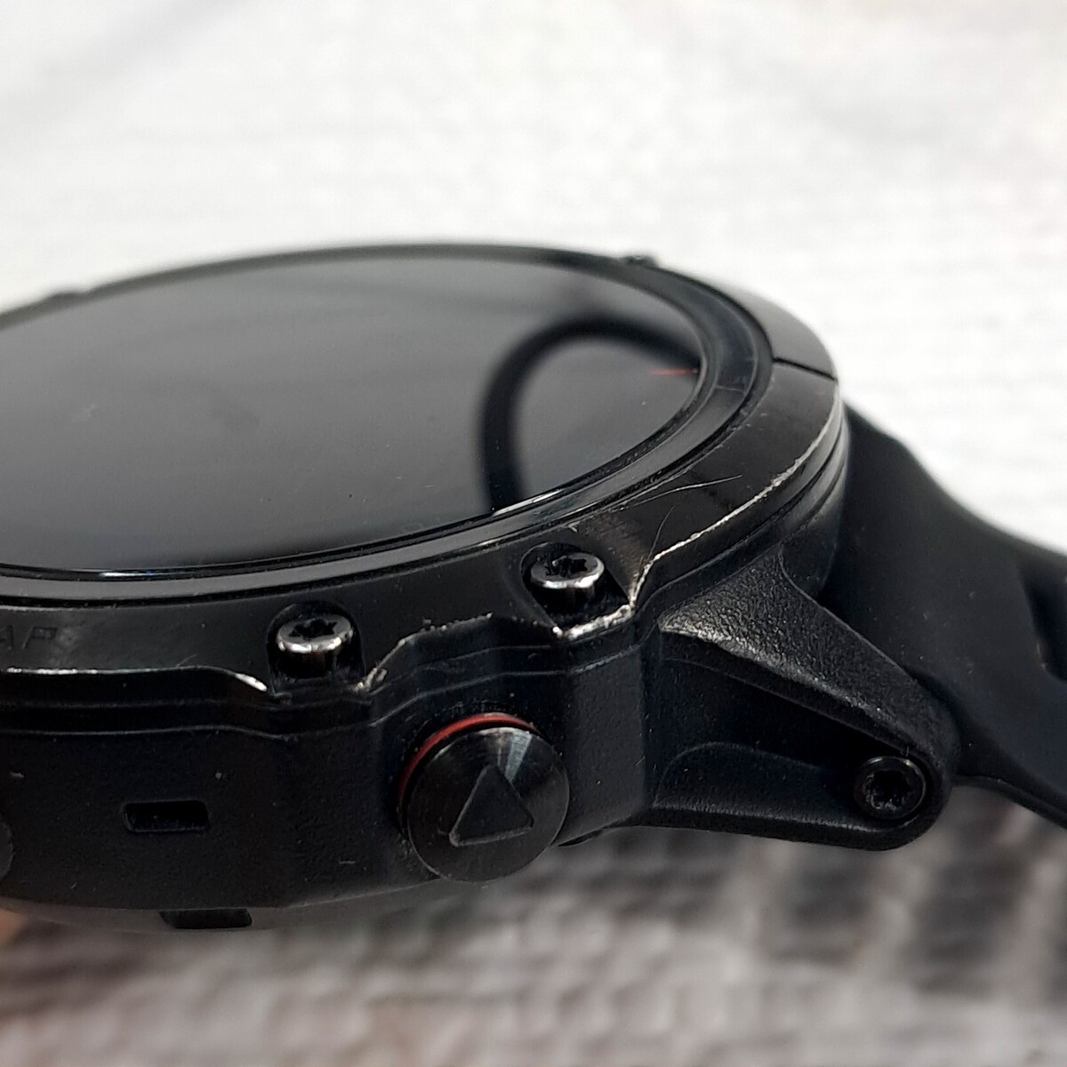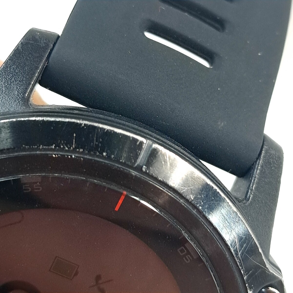 Works great. Includes brand new band and charger. Some cosmetic wear/scratches to the bezel paint as shown. See pics.