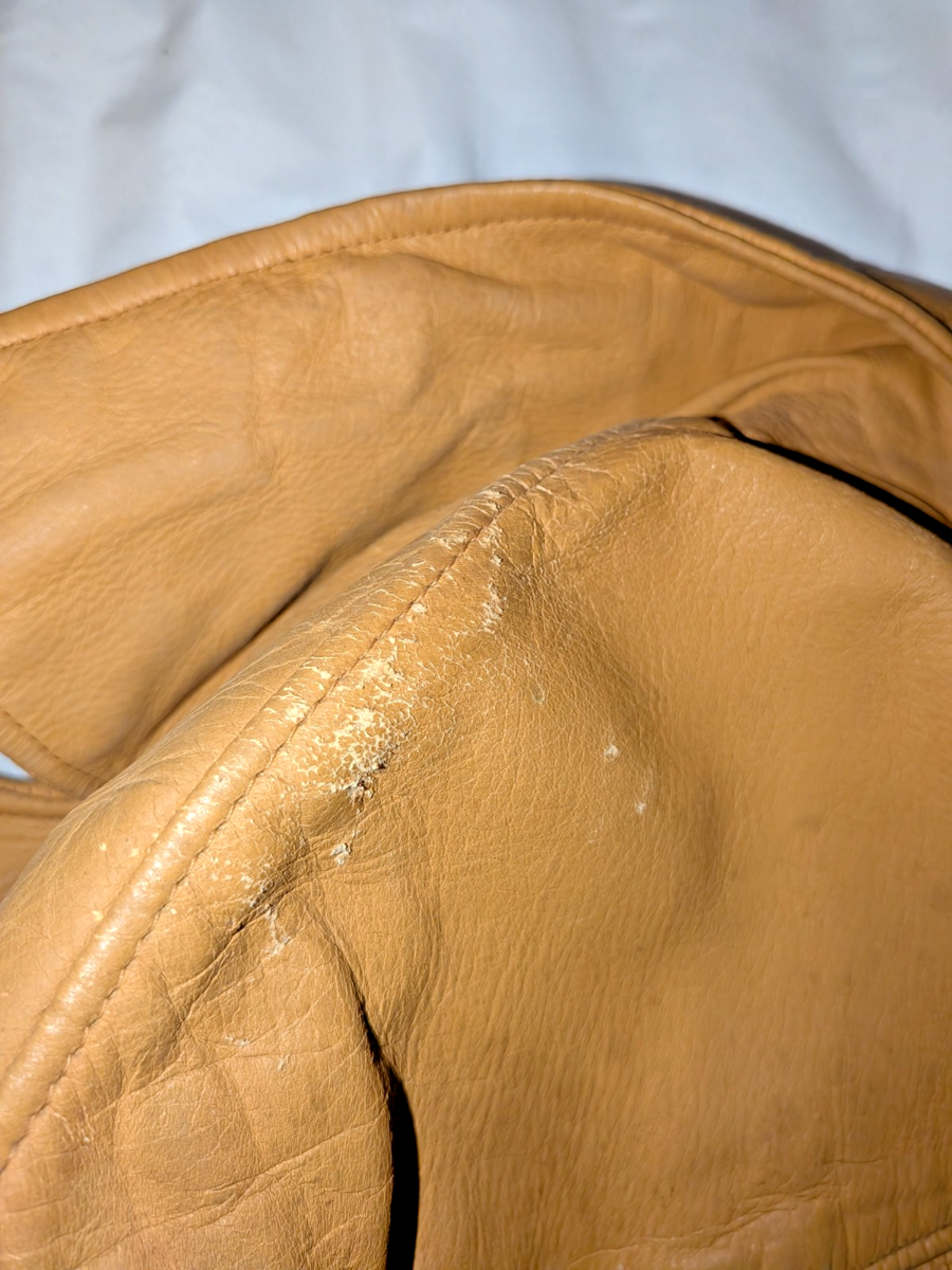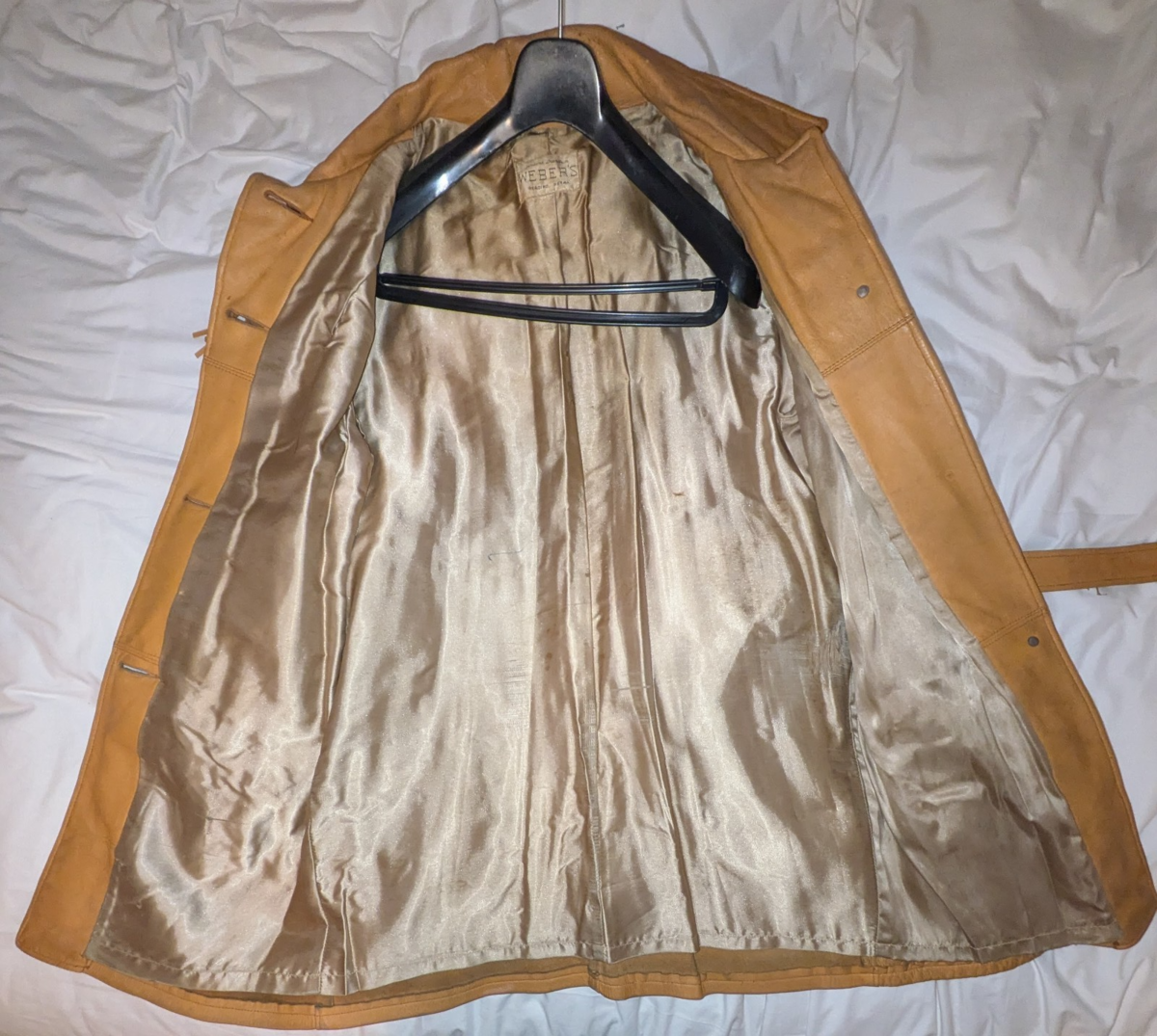 This is a vintage deerskin coat made in the 1960's. It is a golden brown color and is in good vintage condition with flaws. The coat has been stored for decades, and needs a good cleaning. The deerskin is intact with the only wear showing on the shoulders (see pics). The lining is intact with no tears, but the inside of the pockets are torn. Two of the buttons are missing. The coat is approx. women's size 12 and here are measurements: 33" from the back base of the collar to the bottom hem; 19" across from shoulder to shoulder seams; 22" from side seam at waist to other side seam at the waist. If interested and need different measurements, message me. The coat was made for my mother-in-law from deer that was hunted by father-in-law circa 1964, and was crafted by Weber's Deerskin, a family business in Reading PA from 1902 until the last family member retired in 1995. Note: I work hard to list my items as completely and accurately as possible, and as such, all items sold are "as is". Thank you for looking and please see my other items.
