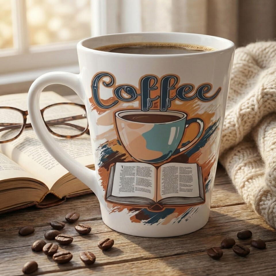This 12oz ceramic latte mug brings a cozy corner cafe to your morning. Hand-drawn style artwork wraps the curved silhouette ? a steaming cup resting above an open book, brushstrokes of warm caramel and teal catching the light. It feels like the slow first sip on a rainy morning: soft, familiar, and quietly energizing. The rounded rim and comfortable C-handle make it easy to cradle during long reading sessions or early work calls. Durable and simple, this mug settles into daily routines ? from library nooks and study desks to kitchen islands and bedside tables ? and makes those small, slow moments feel intentionally warm.