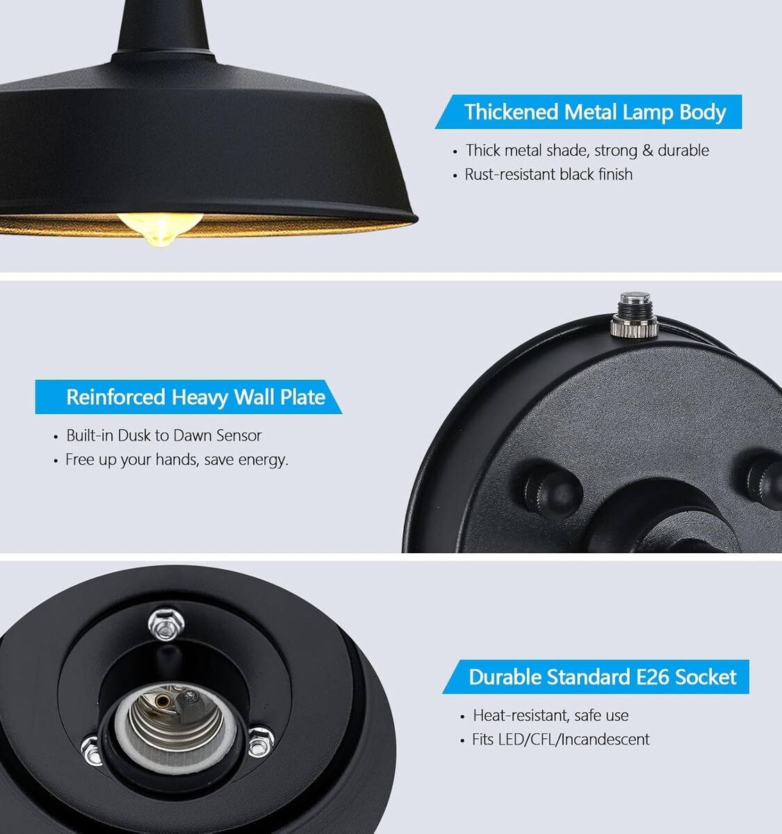 Standard E26 Socket:The outdoor farm light black finish uses standard American E26 bulbs (bulb NOT included), Max 60W, 120V