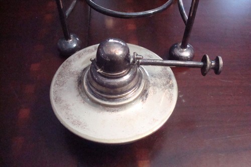Antique Silver Plated Spirit Kettle, Warmer and Stand "After the Famous Christopher Dresser" by William Soutter Sons? marked WS S Co, c1900s, excellent condition, some light surface scratches commensurate with age, it needs light polishing, 12 1/2" tall overall, kettle is 7" tall by 9 1/2" to spout, stand is 7" tall by 5 1/2" side and burner is 3 1/2" by 4" Burner seems new, the overall condition is no use or little use. [OUTCAKRACK2LG3