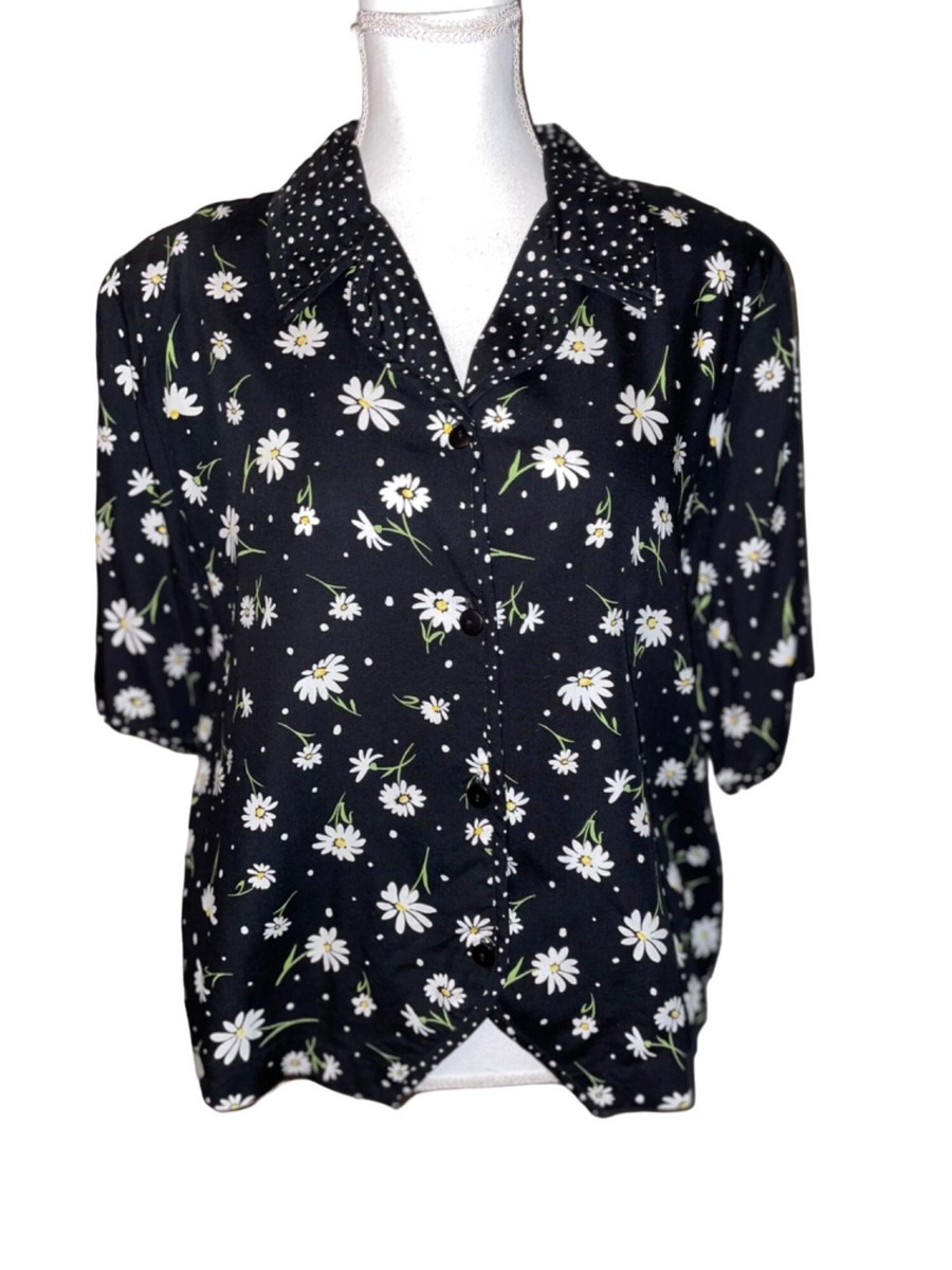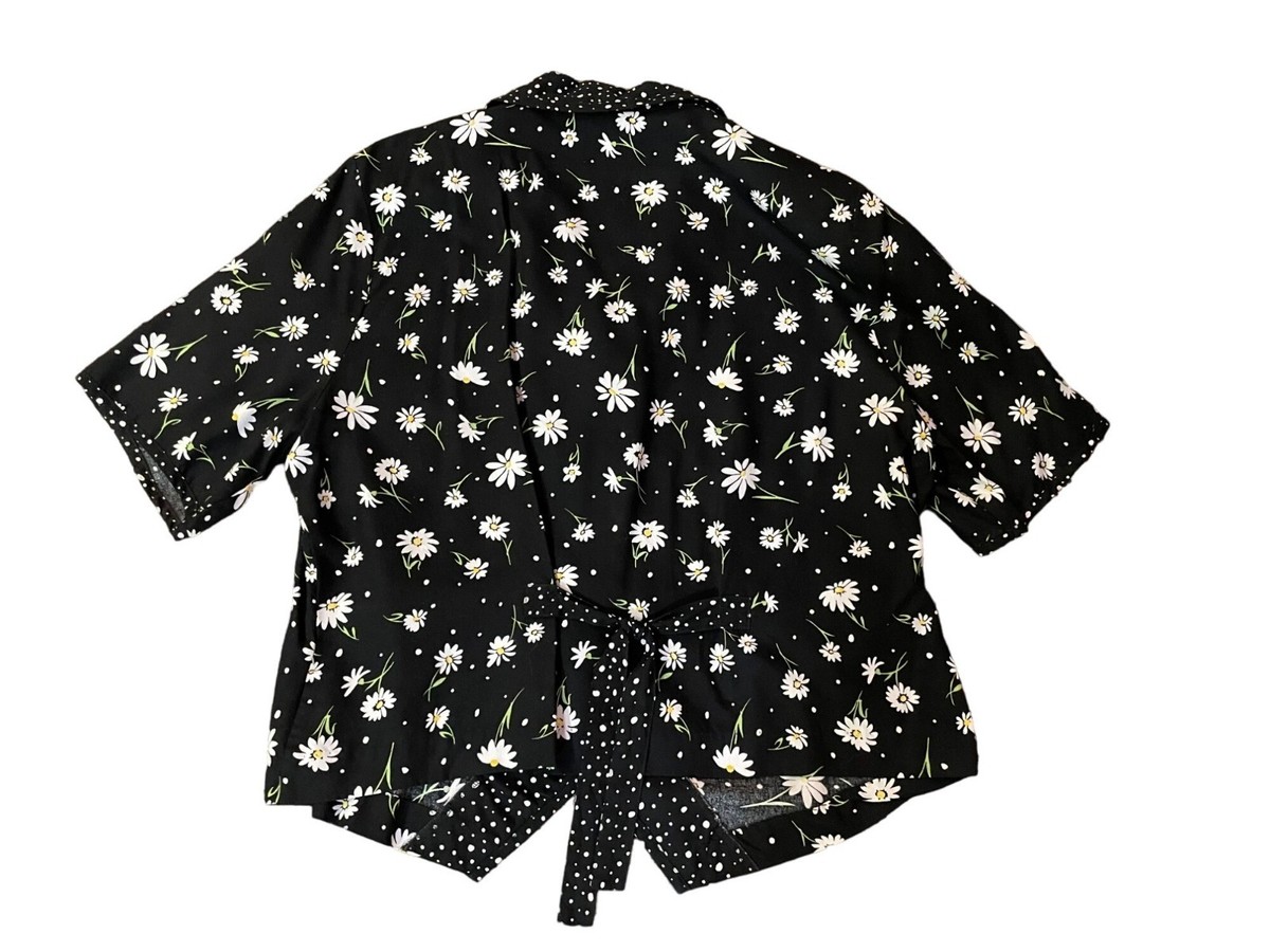 Adorable vintage 90s-inspired blouse with a classic black background, white polka dots, and yellow/white daisies throughout. Such a cute retro cottage-core look!