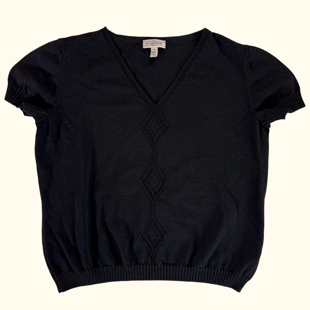 Soft and refined St. John Sport short-sleeve sweater in navy blue. Features a V-neckline with a diamond-textured center detail, ribbed cuffs, and a stretch rib hem. Lightweight wool-rayon blend with that signature St. John hand-feel. No holes, no snags, no damage.