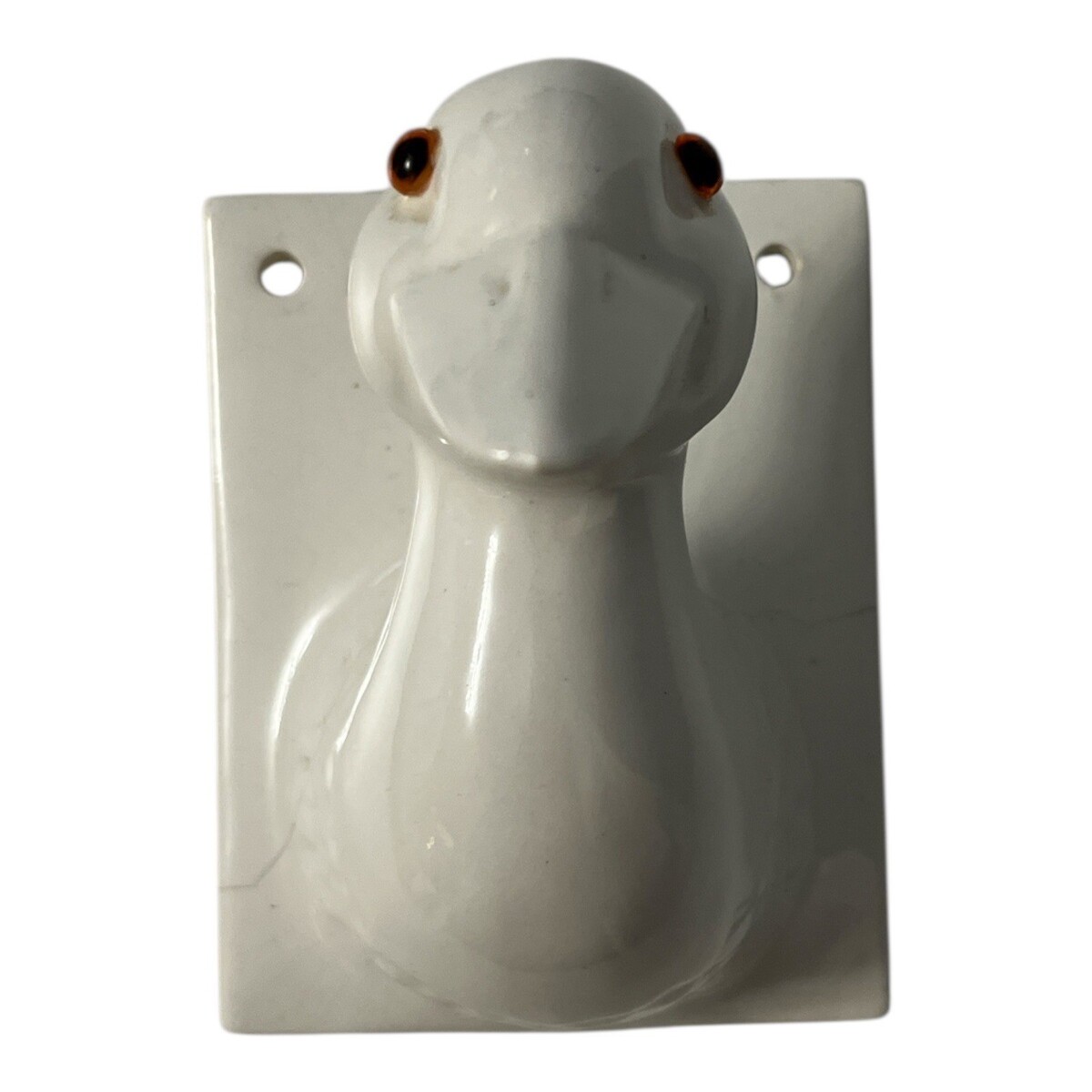 Charming vintage white ceramic bird wall hook made in Japan. Features a glossy glaze, sculpted feather detail, and amber eyes. Designed to mount flat against the wall using the two screw holes on the back. The bird?s neck serves as a lightweight hanging point for items such as keys, scarves, aprons, or decorative accents.