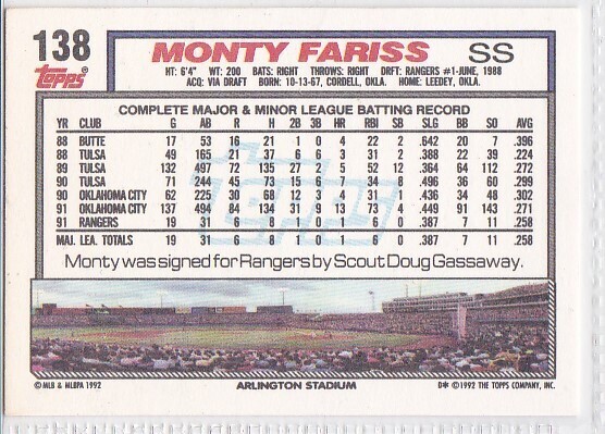 M) 1992 Topps Baseball Trading Card - Monty Fariss #138