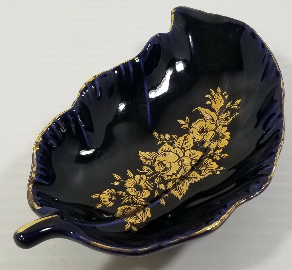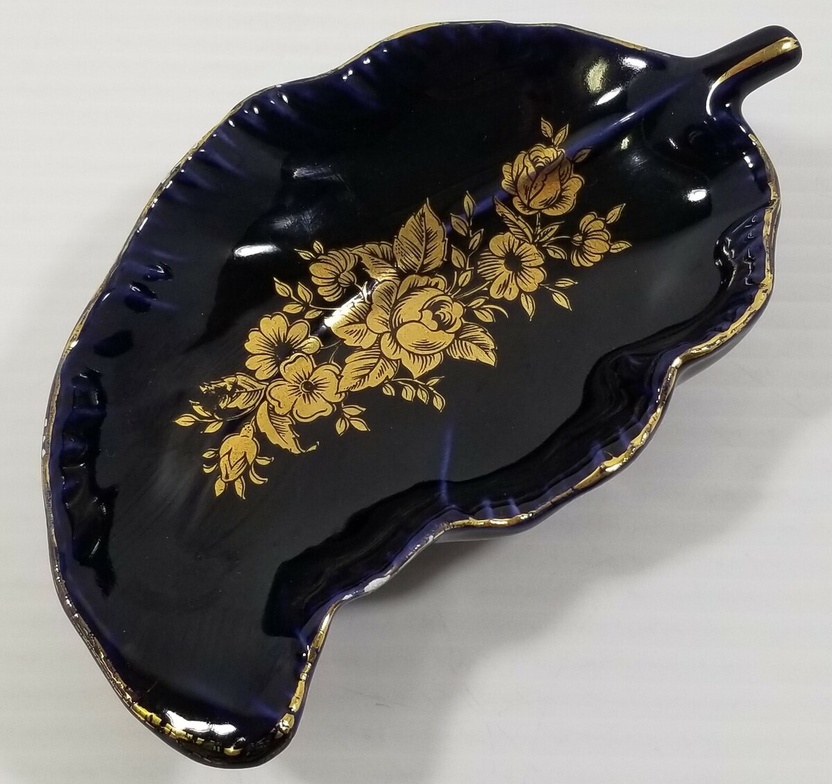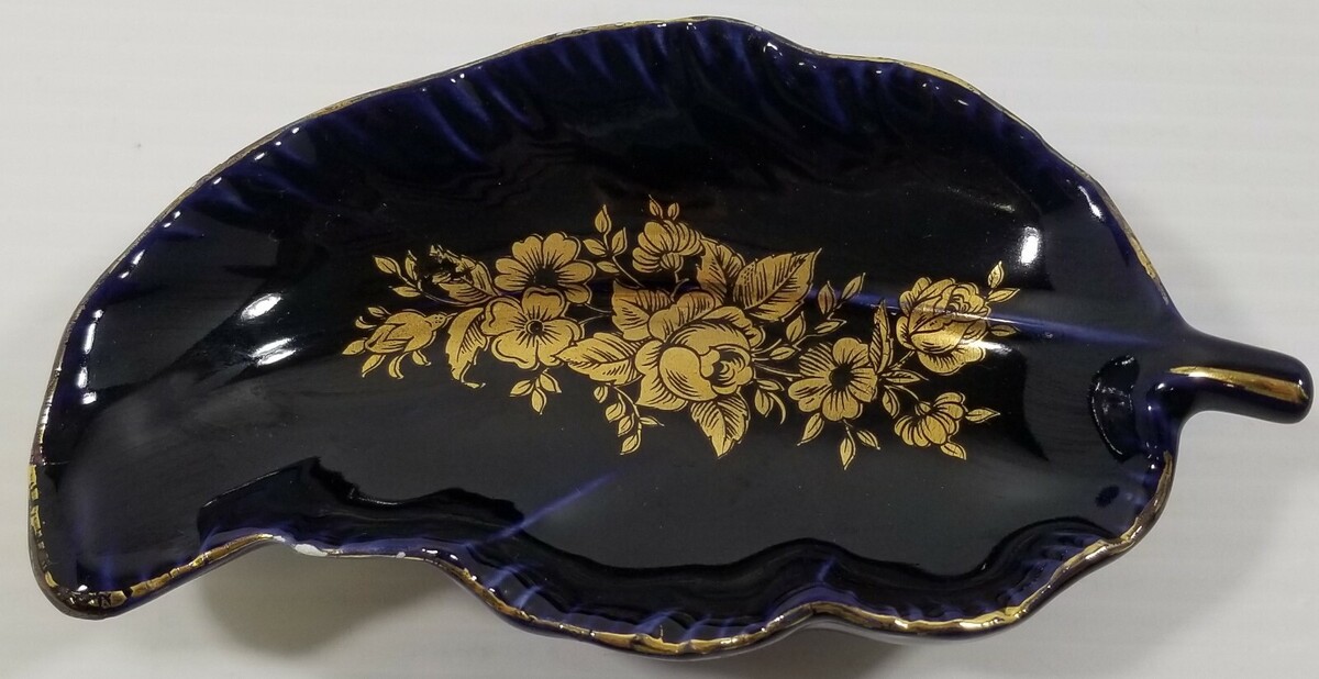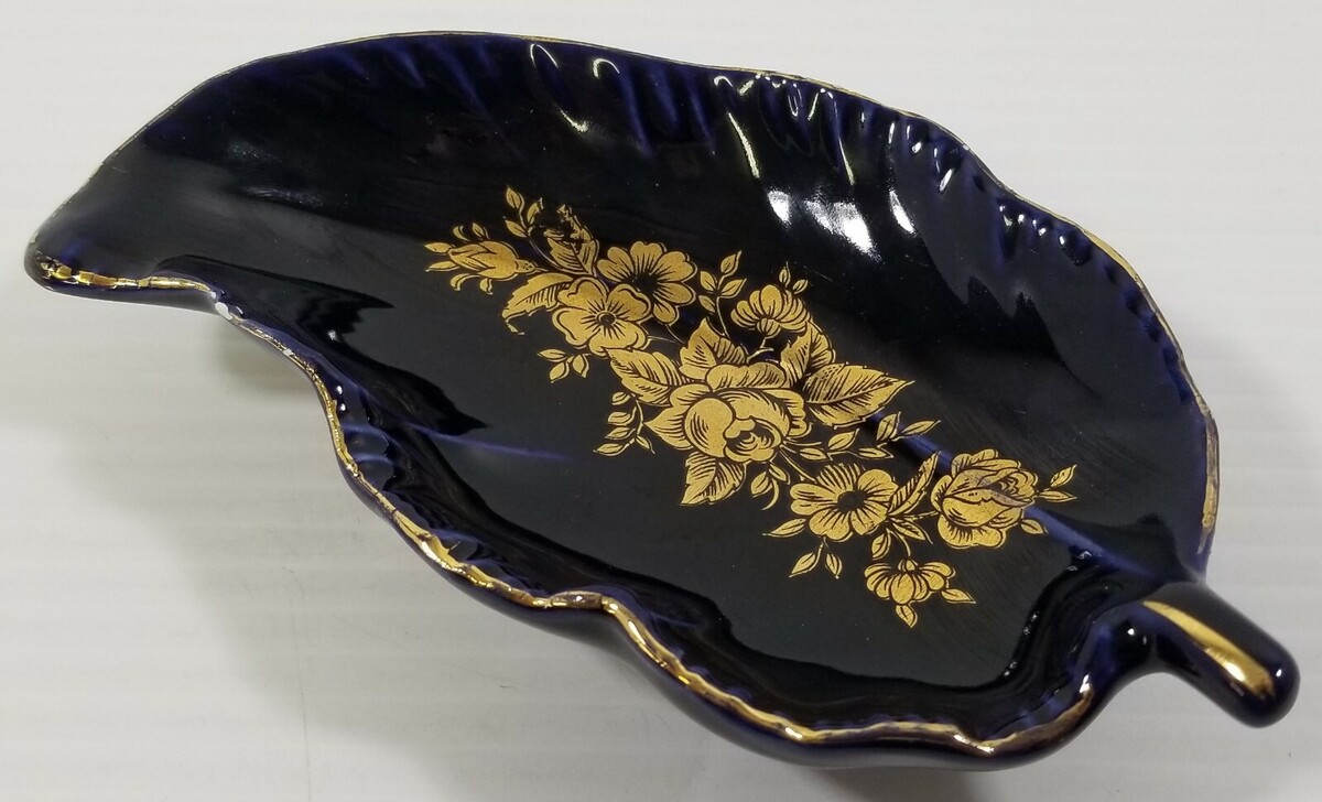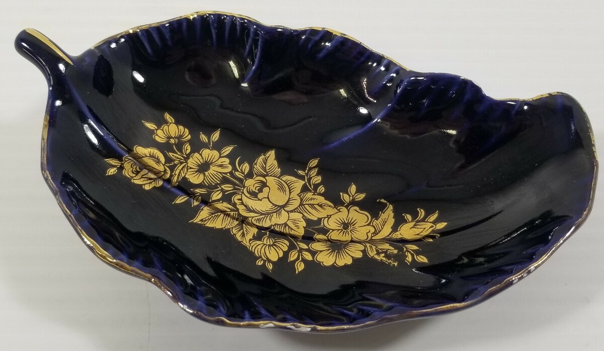 VC) Vintage Peint A La Main Blue Leaf Gold Tone Floral Trinket Candy Dish