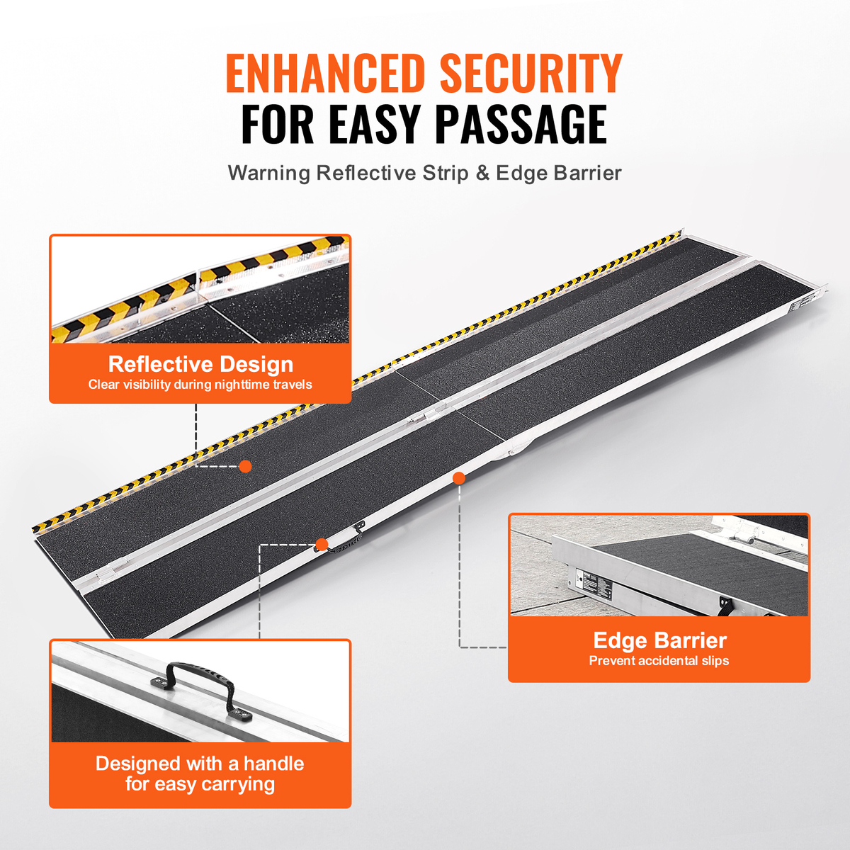 Security First: Equipped with the reflective strip and edge barrier, our portable wheelchair ramp prioritizes security. These features enhance visibility in low-light conditions and prevent accidental slips or collisions, ensuring a smooth and secure journey every time.