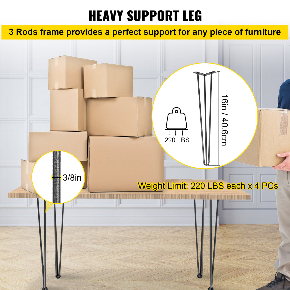 VEVOR Hairpin Table Legs 16" Black Set of 4 Legs 880lbs Load Capacity, 3 Rods