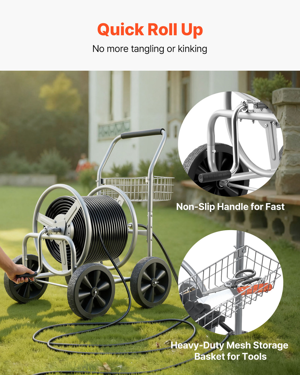 Corrosion-Resistant Build: Built with Q235A steel and brass quick-connect fittings, this garden hose cart passed rigorous salt-spray testing. It handles rain and high-pressure water without rust or leakage, delivering dependable operation for residential and commercial cleaning needs