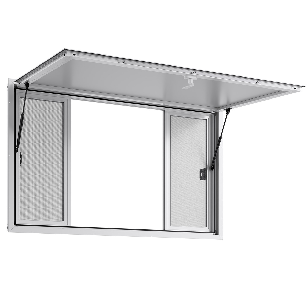 Easy to Open: With an 85 wide opening angle and a clear view, the concession truck window is equipped with two hydraulic rods for opening. The included awning guards against heavy rain, sun, and theft, enabling you to serve customers with ease