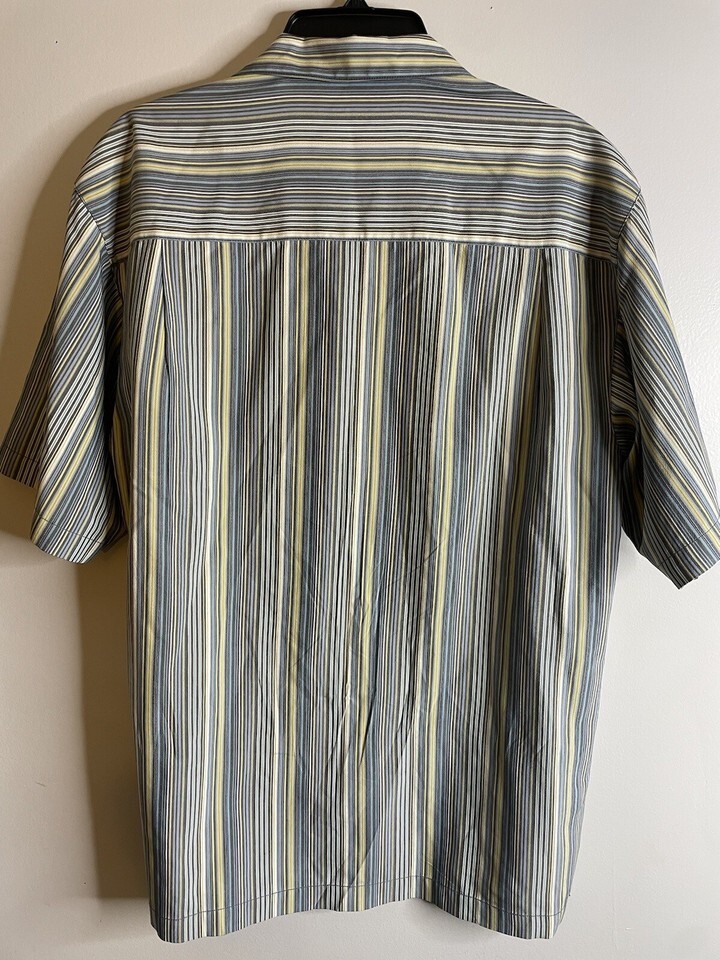 This stylish Tommy Bahama silk shirt is perfect for casual occasions. The short-sleeved button-up shirt features a classic collared neckline with a spread collar style and a Bahamian touch. The striped pattern in blue and yellow adds a touch of elegance to the casual look.