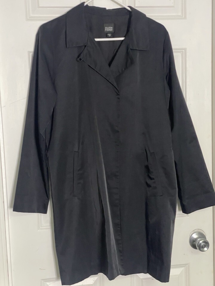 Eileen Fisher Black Cotton Nylon Midlength Lightweight Jacket Coat - Medium