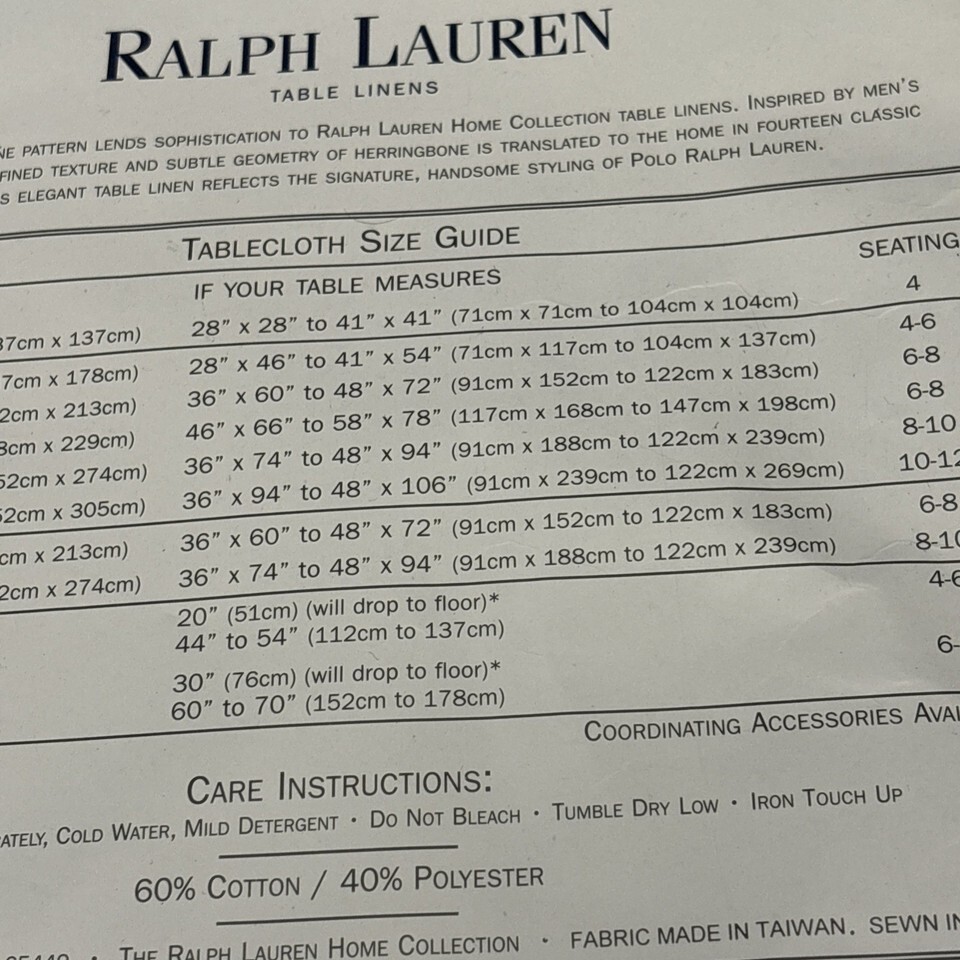 The NEW Ralph Lauren 60x108 Oblong Navy Blue Fairlane Chevron Tablecloth is a stylish and versatile addition to any dining table. Made from a comfortable cotton blend material, this original tablecloth is machine washable up to 100F for easy care. The elegant navy blue color and chevron pattern make it perfect for all occasions, adding a touch of sophistication to your dining experience. With its oblong shape and impressive dimensions of 60x108 inches, this tablecloth is sure to make a statement in your home.