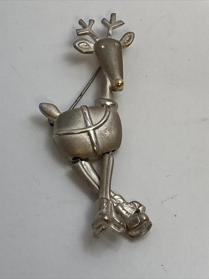 Sterling Silver 925 Christmas XMAS Skating Reindeer Pin 18K Gold Nose BAB 14g
