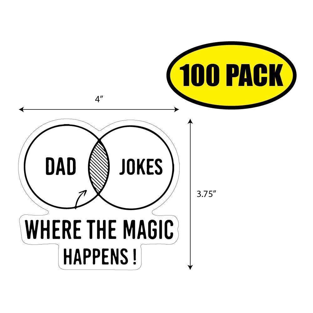 This listing is for a 100 pack of 4" x 3.75" 'DAD JOKES WHERE THE MAGIC HAPPENS!' decals.