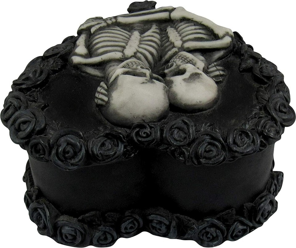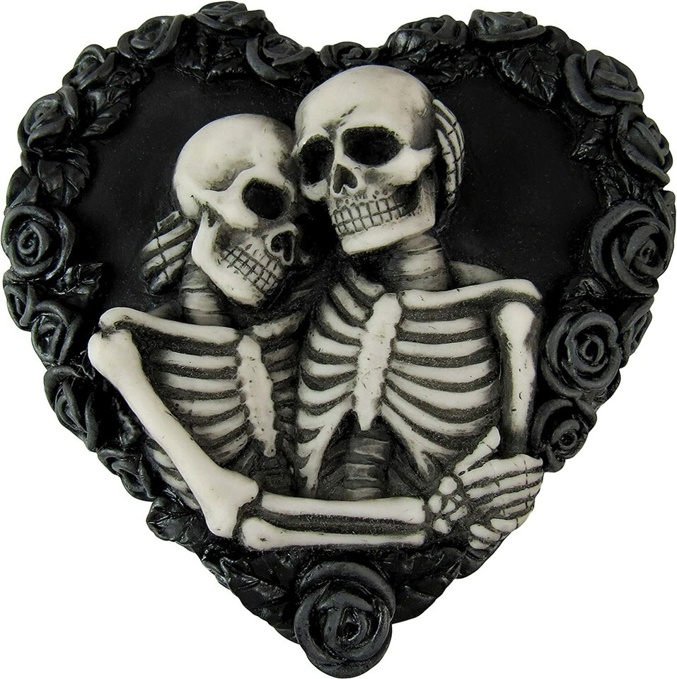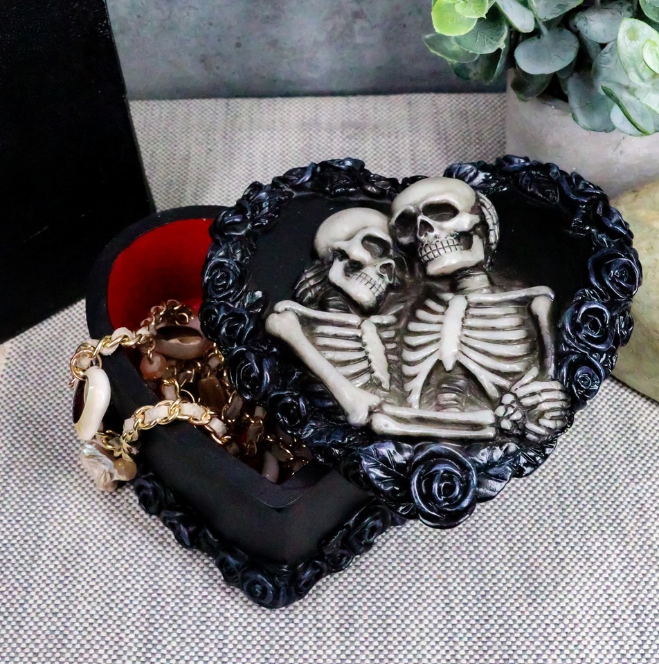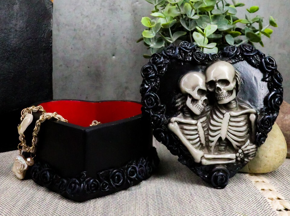 ? TRUE LOVE NEVER DIES - This beautifully sculpted, heart-shaped keepsake box features two skeleton lovers in an eternal embrace, surrounded by a wreath of gothic black roses. The red interior completes this one-of-a-kind piece that symbolizes true love and a passion that never dies.