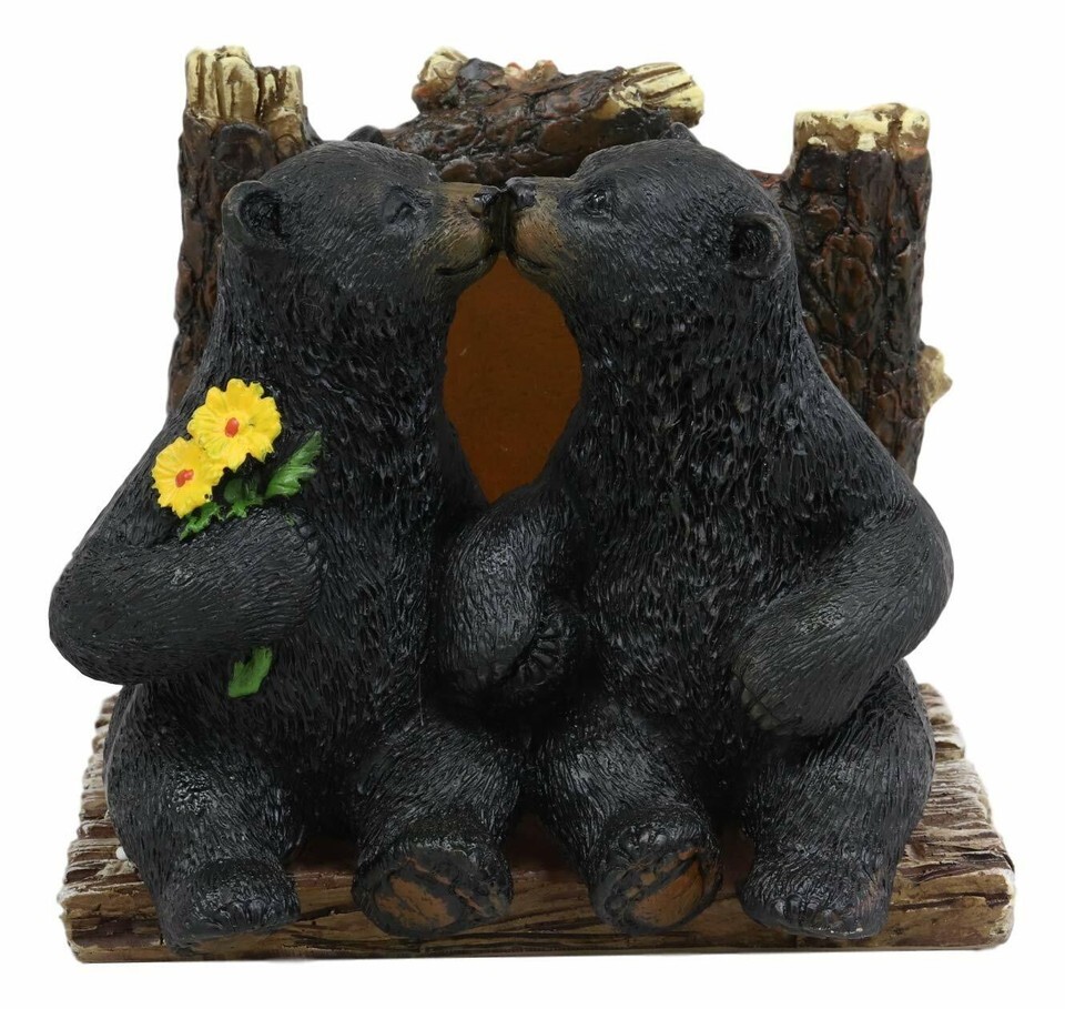 ? Two romantic black bears sits by the forest tree logs sharing love and stealing kisses here and there. Yellow flowers are involved of course but the ambiance of the forest getaway is irresistible for falling in love and sharing love. This bear sculpture serves dual function; as napkin holder and as rustic home and kitchen decor accent.