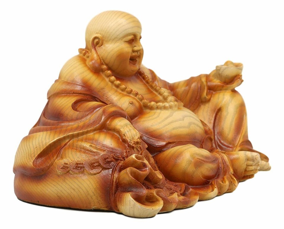 ? This faux wood Hotei sculpture signifies prosperity, wealth, love and longevity for Feng Shui applications. Hotei is laughing, showing contentment in life while holding a golden ingot in his hand while he sits by a pile of gold coins and money.