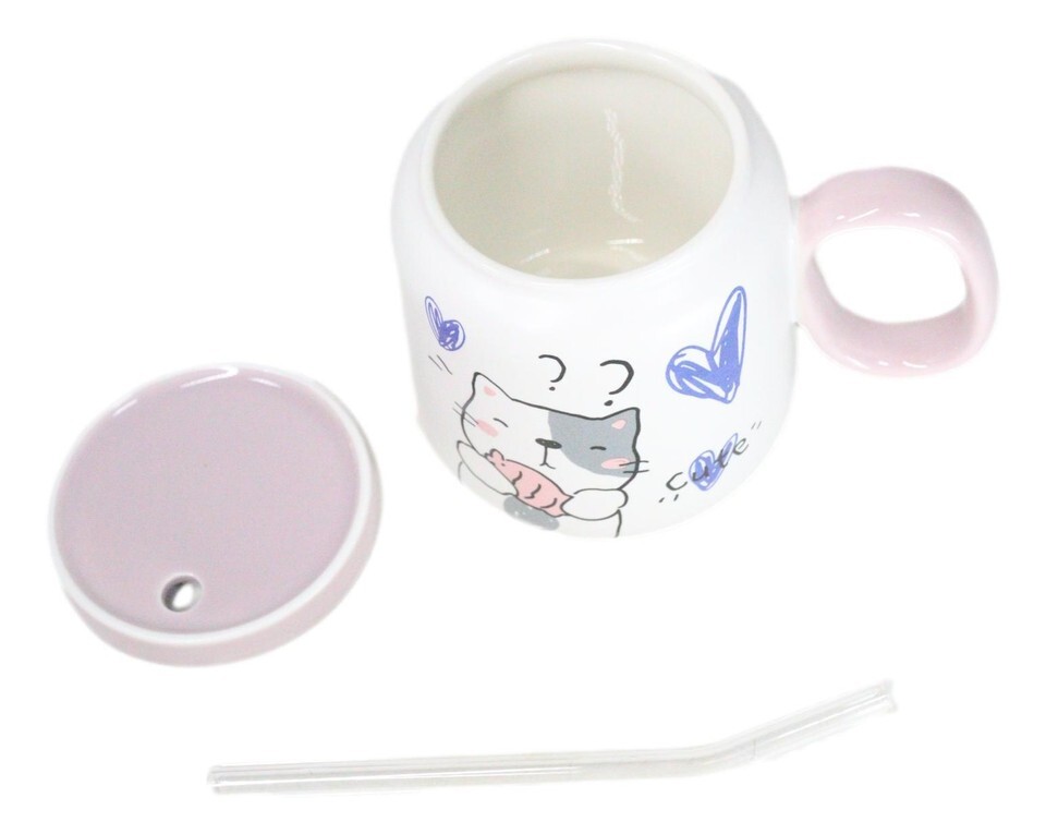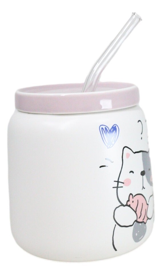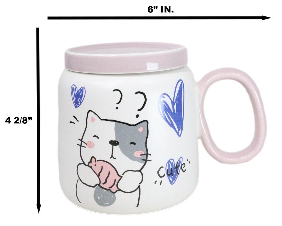 Whimsical Cat Holding Taiyaki Fish 16oz Ceramic Mug Cup With Lid And Glass Straw