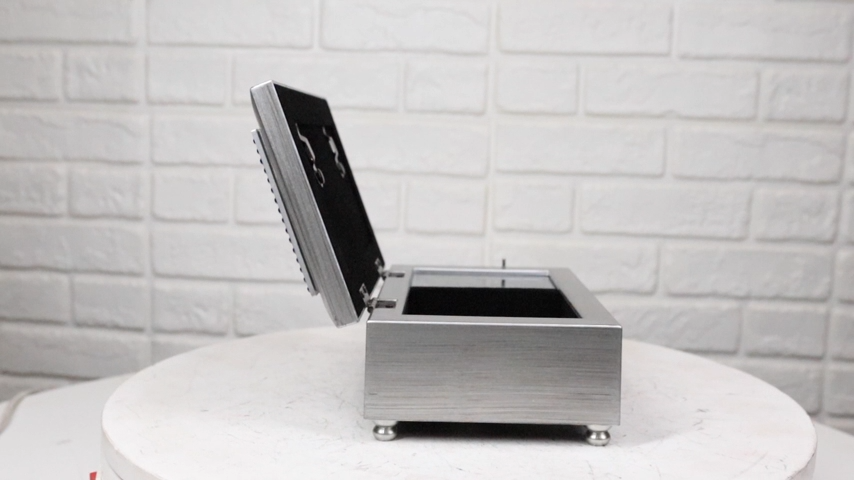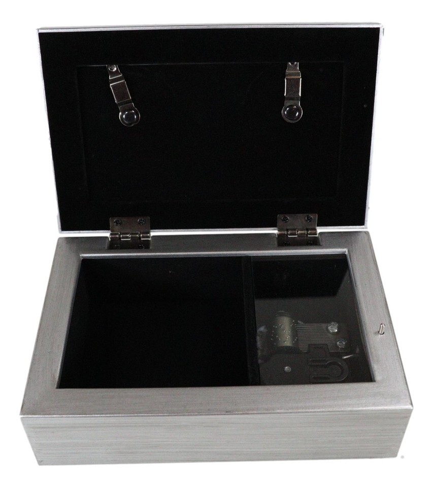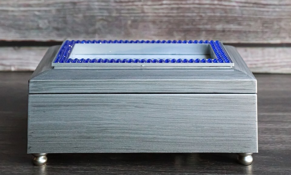 ? Beautiful birthstone jeweled photo frame lid and sweet word sentiment art gives this music box a timeless appeal. Brushed silver finish on the exterior. Personalize this box by replacing the sentiment artwork with 4 x 2 inch photo. Traditional wind-up mechanism engages music to play melodic tune What A Wonderful World. Black velvet lined interior compartment cushions your precious treasures; Decorative bun feet are padded to protect furniture surfaces.